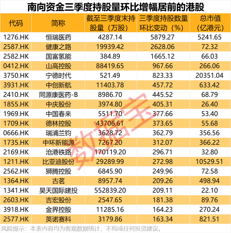 三季度38股获得南向资金持股量环比增长超100%。 南向资金年内净买入超1.1万亿港元 今年以来港股市场主要股指大幅上涨,恒生指数第三季度上涨11.56%,年内涨幅超过30%,恒生科技指数第三季度大涨21.93%,指数创2021年10月以来新高,恒生中国企业指数第三季度上涨10.11%。 据证券时报·数据宝统计,第三季度南向资金合计成交净流入4363.22亿港元,年内已累计净买入11675.15亿港元,超过2023年与2024年净买入金额之和。 ![]() 多家机构研报认为,港股后续行情值得期待。方正证券研报认为,港股对全球流动性改善、美元走弱及风险偏好修复具备较好响应。从历史统计来看,恒生指数在美联储降息前后普遍出现阶段性反弹。相较标普500指数能够展现出稳定超额收益和较高胜率。另外,跨市场布局港股,均衡配置两地优质资产,有利于降低单一市场政策或情绪冲击影响。 中信建投证券认为,香港金管局6月以来已七度承接港元沽盘,累计承接港元相当于5月流入热钱的70%。预计随美联储降息,港美利差明显缩小下,短期再次触及弱方保证概率不高,流动性紧张有所缓解。同时外资不断上调港股市场及中国资产,外资有望持续流入。 南向资金加仓大型科技股 从上榜每日前十大活跃个股名单来看,三季度共有88只个股上榜,阿里巴巴-W三季度港股通成交总额最高,达到5738.58亿港元,中芯国际、腾讯控股、小米集团-W等5股港股通买卖总额均超过1000亿港元。 阿里巴巴-W三季度持续获得南向资金大手笔加仓,港股通成交总额、成交净买入金额均居于首位,港股通持股量已连续12周上升,续创港股通开通以来新高。三季度阿里巴巴-W持续上涨,累计上涨61.2%,最新总市值已达到3.53万亿港元,成为港股互联网巨头中本轮行情中表现最好的个股。 阿里巴巴日前发布公告,截至2025年9月30日的三季度,阿里巴巴以2.41亿美元回购了1700万股普通股(相当于约200万份美国存托股),这些回购在纽约证券交易所进行。相比于2025年6月30日,公司流通股净减少300万股普通股(约40万份美国存托股),净减少比例为0.02%(已计入股权激励计划下的股份发行)。 从成交净买入金额来看,多只大型科技股三季度获南向资金加仓,其中阿里巴巴-W三季度获南向资金净买入金额最高,达到877.08亿港元。另外美团-W获净买入211.22亿港元,腾讯控股获净买入143.58亿港元。上半年表现亮眼的泡泡玛特三季度遭到港股通抛售,净卖出金额40.74亿港元,居于首位。 行情上来看,前十大活跃个股中,11股三季度涨幅超过100%,药捷安康-B以368.33%的涨幅居首,汇量科技、鸿腾精密、东风集团股份紧随其后,分别为195.49%、171.49%、160.87%。 药捷安康-B三季度股价大幅度波动,该股今年6月23日上市,最低价为上市首日的20.2港元/股,最高价达到679.5港元/股,自最低价的最大涨幅达到3263.86%,9月16日创下最高点后,该股显著回撤,最新价较高点回撤幅度接近80%。 ![]() 38股获南向资金持股量环比翻倍 从持股量变化来看,三季度38股获得南向资金持股量环比增长超100%,恒瑞医药居首,环比增长5879.27%;其他还有健康之路、国富氢能持股量环比增长1000%以上。 恒瑞医药三季度获得南向资金大手笔加仓,截至9月30日持股量为4287.14万股,7月以来连续三个月港股通持股量增长超过1000万股。恒瑞医药港股于今年5月23日上市,上市以来股价累计涨幅达到113.17%(包含上市首日涨幅),同期恒瑞医药A股涨幅为29.15%,港股表现显著强于A股。 从港股通持股占港股总股数比例来看,截至9月30日,三季度港股通环比增幅超过100%的个股中,长飞光纤光缆、昊天国际建投、一脉阳光持股比例居前,分别达到69.99%、59.78%、43.43%。 ![]()