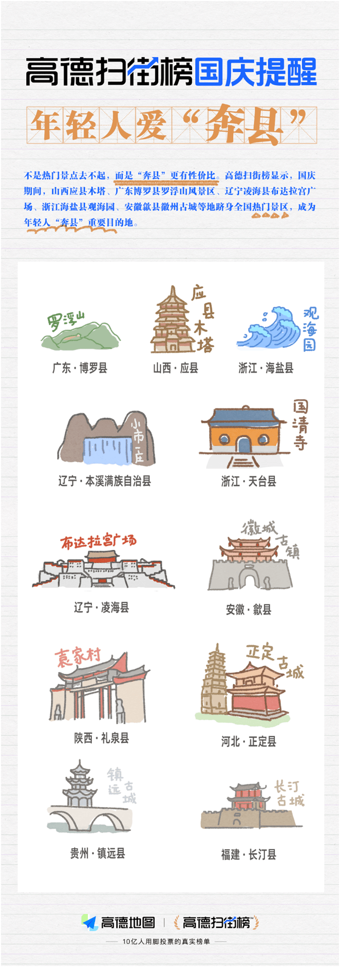 不是热门景点去不起,而是“奔县”更有性价比。根据高德扫街榜数据观察,越来越多年轻人选择远离最热门目的地,将目光投向县城与小镇,实现“反向出行”。 高德扫街榜数据显示,国庆期间,山西应县木塔、广东博罗县罗浮山风景区、辽宁凌海县布达拉宫广场、辽宁本溪小市一庄、浙江海盐县观海园、贵州镇远县镇远古城、福建长汀县长汀古城、浙江天台县国清寺、陕西礼泉县袁家村、安徽歙县徽州古城、河北正定县正定古城等地跻身全国热门景区,成为年轻人“奔县”重要目的地。 年轻人为何纷纷“奔县”?高德扫街榜相关负责人表示:相比一线热门城市,县城游客流相对较少;花费少,性价比更高;同时景区与县域更融为一体,更能感受当地的烟火气,也反映出中国人假期旅游走得更远,进入更深度游的新阶段。 据悉,高德扫街榜基于用户“用脚投票”,对全国各省市“必去景点”有直观的排名,直观地反映各地景点的景气度和热度。