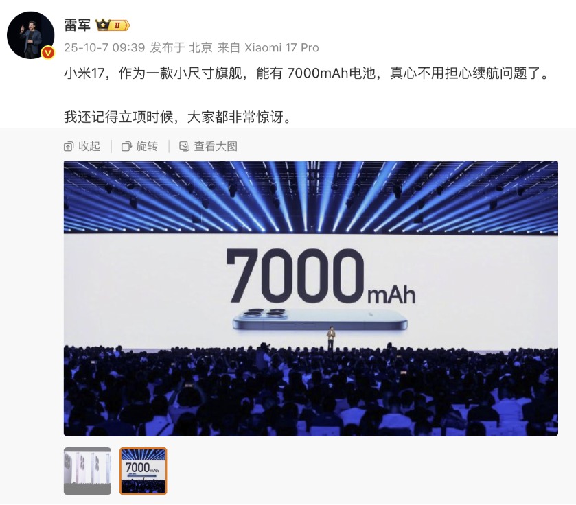 10月7日,小米创办人,董事长兼CEO雷军在社交平台发文表示:小米17,作为一款小尺寸旗舰,能有7000mAh电池,真心不用担心续航问题了。“我还记得立项时候,大家都非常惊讶。”