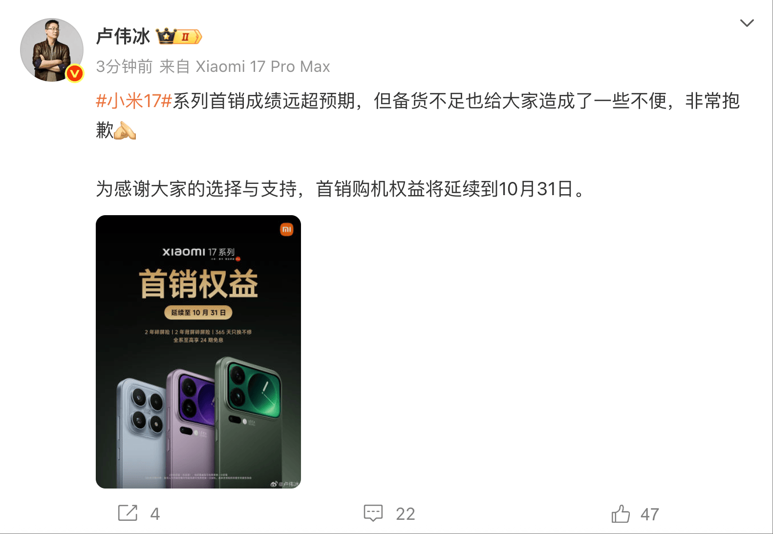 凤凰网科技讯 10月7日,小米集团合伙人卢伟冰发文称,小米17系列首销成绩远超预期,但备货不足也给大家造成了一些不便,非常抱歉。为感谢大家的选择与支持,首销购机权益将延续到10月31日。