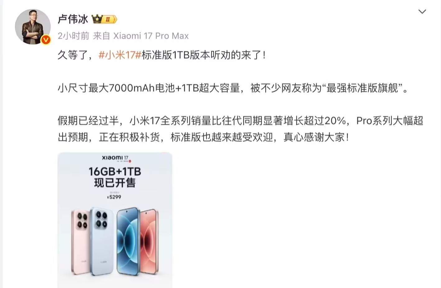 10月5日,卢伟冰发文披露,小米17全系列销量比往代同期显著增长超过20%,Pro系列大幅超出预期,正在积极补货,标准版也越来越受欢迎。 据悉,小米17标准版16GB+1TB现已开售,搭载第五代骁龙8至尊版处理器、7000mAh电池,售价5299元。