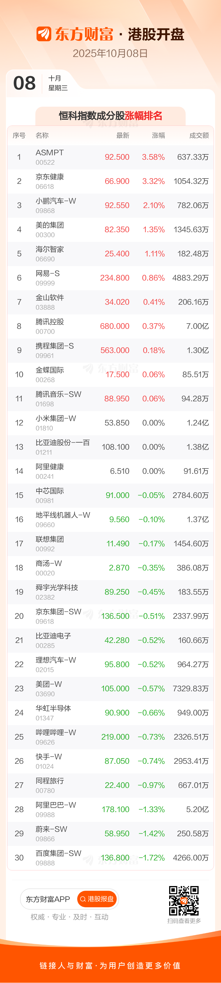 港股10月8日低开,恒生指数开盘报26900.64点,跌57.13点,跌幅0.21%;恒生科技指数开盘报6543.4点,跌6.9点,跌幅0.11%。恒生指数成分股中京东健康、美的集团、信义光能涨幅居前,龙湖集团、银河娱乐、百度集团-SW跌幅靠前。恒生科技指数成分股中ASMPT、京东健康、小鹏汽车-W涨幅居前,百度集团-SW、蔚来-SW、阿里巴巴-W跌幅靠前。