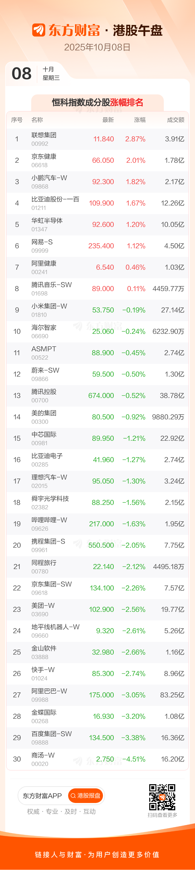 港股10月8日午盘走低,恒生指数收报26669.99点,跌287.78点,跌幅1.07%;恒生科技指数收报6478.81点,跌71.49点,跌幅1.09%。恒生指数成分股中吉利汽车、联想集团、恒安国际涨幅居前,龙湖集团、中升控股、百度集团-SW跌幅靠前。恒生科技指数成分股中联想集团、京东健康、小鹏汽车-W涨幅居前,商汤-W、百度集团-SW、金蝶国际跌幅靠前。
