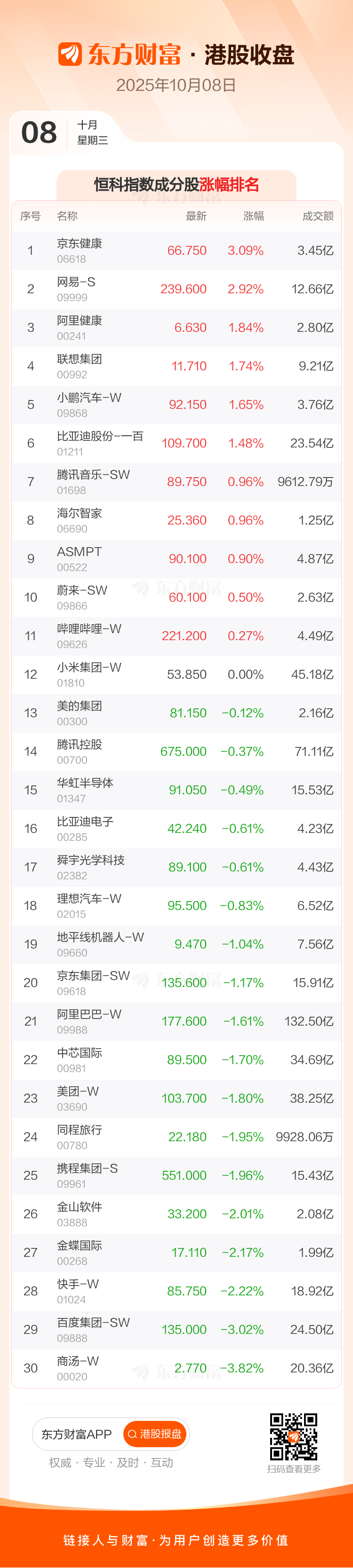 港股10月8日收盘走低,恒生指数收报26829.46点,跌128.31点,跌幅0.48%;恒生科技指数收报6514.19点,跌36.11点,跌幅0.55%。恒生指数成分股中恒安国际、吉利汽车、京东健康涨幅居前,龙湖集团、百度集团-SW、中国海外发展跌幅靠前。恒生科技指数成分股中京东健康、网易-S、阿里健康涨幅居前,商汤-W、百度集团-SW、快手-W跌幅靠前。