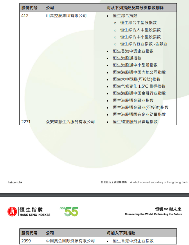 恒指公司发布通知称,山高控股、众安智慧生活、中国黄金国际在证券及期货事务监察委员会的股权高度集中名单上,故不再符合纳入恒生指数系列的标准。因此,于2025年10月24日收市后,山高控股将自恒生综合指数等指数中被剔除,众安智慧生活将自恒生物业服务及管理指数中被剔除,中国黄金国际将自恒生香港中资企业指数中被剔除。