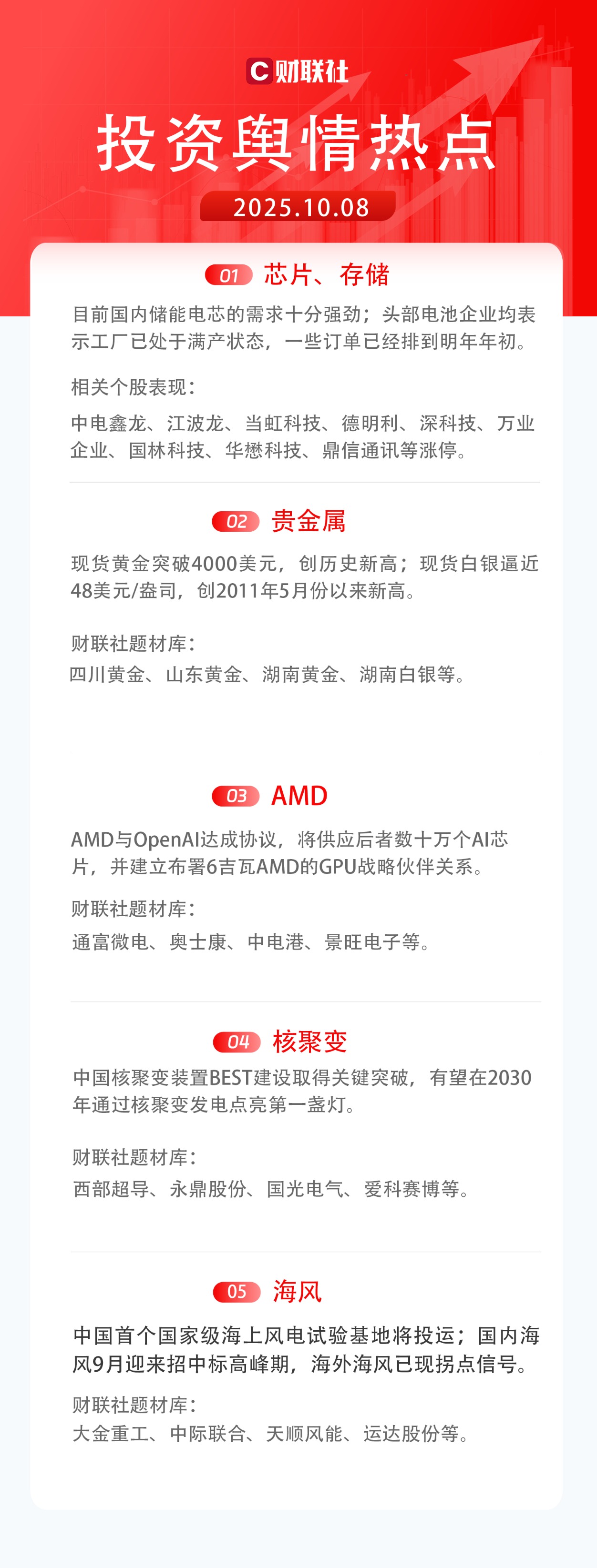 假期投资舆情热点 专业金融数据,下一代智能终端 1)芯片、存储:目前国内储能电芯的需求十分强劲;头部电池企业均表示工厂已处于满产状态,一些订单已经排到明年年初。 2)贵金属:现货黄金突破4000美元,创历史新高,年内涨幅52%;现货白银逼近48美元/盎司,创2011年5月份以来新高。 3)AMD:AMD与OpenAI达成四年协议,将供应后者数十万个AI芯片,并建立布署6吉瓦AMD图形处理器(GPU)的战略伙伴关系。 4)核聚变:10月1日,中国核聚变装置BEST建设取得关键突破,有望在2030年通过核聚变发电点亮第一盏灯;10月1日,德国政府在柏林的联邦内阁会议上通过了一项名为“德国迈向核聚变发电站”的行动方案,力图在德国建造世界上第一座核聚变发电站;10月2日,美国聚变工业协会(FIA)正式发布白皮书,以“推动公共部门数据开放”为核心,为全球核聚变产业从“科研攻坚”向“商业落地”转型提供关键路径。 5)海风:国内海风市场9月迎来招中标高峰期,海外海风市场已现拐点信号,欧洲海风装机规模今年提升至4.5吉瓦以上;中国首个国家级海上风电试验基地即将投运,可开展目前世界最大容量风电机组和最长尺寸风机叶片的检测试验,以及多领域国际前沿技术研究。 ![]() (文章来源:财联社) |