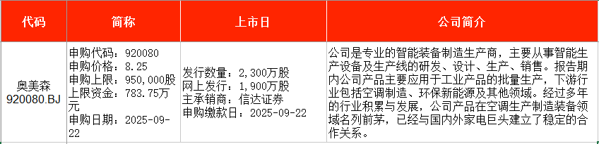 “十一”假期后首周,A股暂无新股申购。 澎湃新闻根据Wind及公开信息梳理统计,本周(10月9日至10月10日)暂无新股安排网上申购。 “十一”假期前的最后一个交易日,广州瑞立科密汽车电子股份有限公司(下称“瑞立科密”,001285)、云汉芯城(上海)互联网科技股份有限公司(下称“云汉芯城”,301563)均登陆深交所。其中,瑞立科密上市首日的单签浮盈为1.06万元,云汉芯城上市首日的单签浮盈高达4.49万元。 周五(10月10日)北交所将有1股上市,为格力电器、美的集团的供应商——奥美森智能装备股份有限公司(下称“奥美森”,920080)。 ![]() 一、本周新股上市 从时间表看,奥美森智能装备股份有限公司(下称“奥美森”,920080)将在本周五(10月10日)上市。 ![]() 据开源证券研报,奥美森是专业的智能装备制造生产商,主要从事智能生产设备及生产线的研发、设计、生产、销售,公司产品可广泛应用于电器、环保、风电和锂电新能源及其他行业等领域,是实现生产自动化、智能化和高效化的关键装备。 公司主要产品包括换热器生产智能设备、管路加工智能设备和其他定制智能设备(环保设备、锂电池热压整形设备和风电叶片根部数控铣削机等)。 公司自2003年成立以来,深耕热交换和管路加工技术,与国内外主要电器生产企业如格力电器、美的集团等保持长期稳定合作关系。2022年至2024年,公司营业收入分别为2.79亿元、3.25亿元和3.58亿元,归母净利润分别为1938.93万元、4816.47万元和5582.25万元。2025年半年报营收为1.91亿元,归母净利润为3265万元。