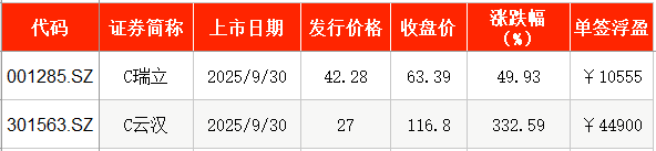 二、上周新股回报 节前最后一周,共有2只新股上市,分别为广州瑞立科密汽车电子股份有限公司(下称“瑞立科密”,001285)、云汉芯城(上海)互联网科技股份有限公司(下称“云汉芯城”,301563)。 而新股市场“赚钱效应”继续,瑞立科密和云汉芯城的上市首日单签浮盈均过万元。 ![]() 9月30日,瑞立科密在深交所正式挂牌上市,发行价为42.28元/股,截至上市首日收盘,该股报63.39元/股,涨幅为49.93%。以收盘价计算,投资者中一签浮盈为1.06万元。 9月30日,云汉芯城在深交所正式挂牌上市,发行价为27元/股,截至上市首日收盘,该股报116.8元/股,涨幅为332.59%。以收盘价计算,投资者中一签浮盈为4.49万元。 三、上周A股IPO上会 发审委审核方面,北交所上周召开新一期上市审核委员会审议会议。9月30日,北交所审议通过了新天力科技股份有限公司(下称“新天力”)的首发事项。 ![]() 公开资料显示,新天力是国内食品容器行业的领军企业,自设立以来一直专注于为客户提供一站式的食品容器综合解决方案。公司秉承“以创新科技的容器保护好食品,为人类健康和美好生活奋斗不息”的使命,专业服务于食品工业、餐饮、街饮等消费品牌客户。 公司依托持续创新的技术、优质的产品质量和出色的定制开发能力,为香飘飘、蜜雪冰城、伊利、蒙牛、西贝莜面村、农夫山泉等知名食品工业企业、连锁餐饮品牌提供多场景、全方位的食品容器综合解决方案。 四、港股最新动态 Wind数据显示,本周(10月9日-10月12日)港股的轩竹生物-B(02575.HK)将在周四至本周五申购。云迹(02670.HK)则将于周四至周日申购。 ![]() 9月28日至10月8日,港股共有32家公司递交招股书。 其中,诚益生物开曼有限公司、阳光电源股份有限公司、岚图汽车科技股份有限公司、深圳华付技术股份有限公司、珠海宝丰堂半导体股份有限公司、四川好医生云医疗科技集团股份有限公司、上海森亿医疗科技股份有限公司、深圳市锐明技术股份有限公司、中国国信服务控股有限公司、安徽华恒生物科技股份有限公司、武汉滨会生物科技股份有限公司、利欧集团股份有限公司、珠海精实测控技术股份有限公司、烟台蓝纳成生物技术股份有限公司、珞石(山东)机器人集团股份有限公司、深圳市欢创科技股份有限公司、深圳市晶存科技股份有限公司、陕西麦科奥特医药科技股份有限公司、武汉聚芯微电子股份有限公司、大金重工股份有限公司、极米科技股份有限公司、普源精电科技股份有限公司、合肥晶合集成电路股份有限公司、长春高新技术产业(集团)股份有限公司、米连科技有限公司、自然堂全球控股有限公司等26家公司为首次递交。 安诺优达基因科技(北京)股份有限公司、奥联服务集团股份有限公司、Boche Holding Limited、贝达药业股份有限公司、四川百利天恒药业股份有限公司、微医控股有限公司(境外)等6家公司为更新招股书。 深圳市广和通无线股份有限公司、北京云迹科技股份有限公司、北京同仁堂医养投资股份有限公司、福建海西新药创制股份有限公司、聚水潭集团股份有限公司等5家公司的聆讯通过。 瀚天天成电子科技(厦门)股份有限公司、青岛文达通科技股份有限公司、东鹏饮料(集团)股份有限公司、四川新荷花中药饮片股份有限公司、深圳市尚鼎芯科技股份有限公司、拉拉科技控股有限公司、长宏新材集团有限公司等7家公司的申请失效。 ![]() 五、投融资大事记 1、9月29日,苏州灵猴机器人有限公司宣布成功完成超亿元A轮融资。本轮融资由金鼎资本、博原资本、TCL创投共同领投,同时引入苏创投、东运创投、财通资本、银杏谷资本等多家知名投资机构。 2、9月29日,超高仿生情感交互机器人企业首形科技(AheadForm)宣布完成新一轮融资,这是首形科技本年度完成的第三轮融资,本轮由蚂蚁集团领投,锦秋基金联合投资,同时引入厚雪资本、弘晖基金等知名风险投资基金和鹏城愿景基金等科研机构基金。老股东顺为资本、招商局创投、Taihill持续超额追投。 3、9月29日,斯年智驾(Senior.Auto)宣布完成数亿元B+轮融资,本轮融资由郑州高新产投基金、浙江省创新投资私募基金管理有限公司、华融等投资机构与产业资本联合投资。 4、9月29日,深圳市时代速信科技有限公司宣布完成由无锡梁溪区政府联合无锡市梁溪科创产业投资二期基金合伙企业(有限合伙)(以下简称“博华资本”)独家投资的数亿元人民币D轮融资。 5、9月30日,天境生物(TJ Biopharma)宣布成功完成近6亿元人民币的C2轮融资。本轮融资由中金资本旗下基金领投,沂景资本、东方富海、之科基金、椿灵投资、新毅投资等机构跟投,老股东和达投资、清松资本、屹远投资及钱塘城发亦持续加码。 6、9月30日,踏歌智行完成C+轮融资,总交易金额超2亿元。本轮融资的参与方包括信泰人寿保险旗下杭州盛世玉衡基金、云松投资旗下池州踏歌智行云创基金等。 延伸阅读![]() (文章来源:澎湃新闻) |