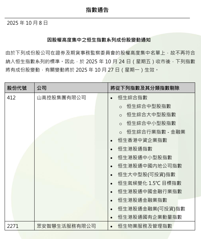 即将被恒生综合指数等多个指数剔除 山高控股跌逾13%
