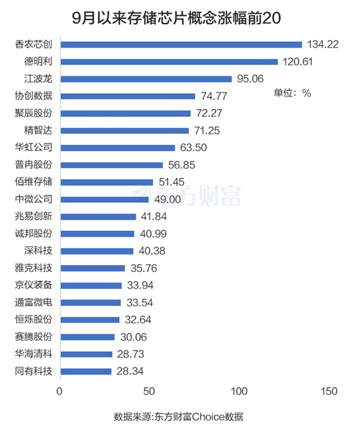 假期后的首个交易日,除贵金属、可控核聚变外,科技股依然是市场的热点,其中存储芯片方向较为强势,板块中雅克科技、通富微电、深科技、赛腾股份、大为股份、太极实业纷纷涨停;华虹公司则大涨超10%;香农芯创、北京君正、恒烁股份也涨幅靠前。 ![]() 存储芯片掀起“涨价潮” 在不少市场人士看来,存储芯片的强势,与行业正在经历的涨价潮密切相关,比如NAND大厂闪迪(SanDisk)年内已两次宣布涨价,美光、三星、SK海力士、群联等巨头也在近期有了涨价的迹象或者宣布将在第四季度涨价。 ![]() 在此背景下,不少机构纷纷预测四季度存储价格或将延续涨势。根据CFM闪存市场近日发布的2025年四季度存储市场展望报告,预计四季度服务器eSSD涨幅将达到10%以上,DDR5 RDIMM价格涨幅约10%~15%;Mobile嵌入式NAND涨幅约5%~10%,LPDDR4X/5X涨幅约10%~15%;PC端LPDDR5X/D5价格涨幅预计将落在10%~15%,cSSD价格涨幅达5%~10%。 中信证券则指出,9月以来,根据Bloomberg、CFM闪存市场,NAND Flash Wafer和部分存储模组均有不同程度上涨,涨幅个位数。展望后续,Trend Force预计2025年四季度NAND Flash价格将上涨5%~10%,后续数据中心eSSD涨价幅度有望超市场预期,2026年大容量QLCSSD有望出现爆发性增长。 信达证券也预测,AI产品增长影响存储供需两端,四季度DRAM和NAND价格预计延续增长态势。TrendForce则预估,第四季度旧制程DRAM整体价格环比增长8%~13%,HBM价格环比增涨13%~18%;NAND Flash第四季度各类产品合约价或将全面上涨,平均涨幅预计达到5%~10%。 行业龙头股价狂飙 从存储芯片巨头一段时间的股价表现来看,也能感受到存储芯片行业的高景气。比如美国的存储巨头闪迪和美光科技9月以来分别上涨151.34%和65.31%,日本的存储巨头铠侠9月以来股价大涨139.6%。 A股的存储芯片概念近期同样表现亮眼。东方财富Choice数据显示,9月以来香农芯创(代理/分销商)大涨134.22%,德明利(存储模组)大涨120.61%。江波龙(存储模组)、协创数据(存储模组)、聚辰股份(存储接口)、精智达(封装与测试)等也在9月以来明显上涨。整体而言,存储芯片66只概念股9月以来有52股上涨,板块上涨概率约79%,上涨中位数为11.88%。 ![]() AI“大单”集中涌现 进一步而言,AI的快速发展,尤其近期行业不断爆出的“大单”,更是带来了需求激增的高光景象。 拿国庆假期期间来说,先是OpenAI与三星电子、SK海力士宣布达成初步供货协议,两家韩国公司将为“星际之门”(Stargate)项目供应存储芯片。韩国总统办公室表示,OpenAI计划在2029年订购90万片存储芯片晶圆。而后OpenAI又与芯片巨头AMD宣布了一项巨额算力基建协议,两家公司将合作部署总计6吉瓦的算力。 而此前9月,英伟达则与OpenAI宣布达成了一项10吉瓦的算力合作,前者预计向OpenAI投资1000亿美元以提供后者购买算力设备的现金。此外,甲骨文、软银等巨头,也纷纷签署过算力相关的巨额订单。 OpenAI首席执行官萨姆·奥尔特曼最新表示,更多这样的交易正在进行中。奥尔特曼表示,OpenAI未来的模型和即将推出的其他产品将会更加强大,从而推动更多的需求。 不少机构也认为,AI的发展将带来存储芯片的需求激增。华西证券就表示,在当下AI的驱动下,存储芯片的需求激增。开源证券也指出,在供应端,今年以来各大存储厂商均发布减产计划,存储市场库存去化明显;在需求端,国内外大厂加大AI资本投入,推动企业存储需求升温。摩根士丹利更是认为,在人工智能热潮下,存储芯片行业预计迎来一个“超级周期”。 根据Yole Group的《2025年存储行业现状报告》,全球存储收入在2024年达到1700亿美元,并有望在2025年再增18%,达到2000亿美元。AI手机、AI PC、AI服务器逐渐成为拉动存储器需求增长的主要三大动力来源。 3股被杠杆资金抢筹超10亿 在这样的大背景下,存储芯片概念也成了杠杆资金的香饽饽。东方财富Choice数据显示,9月存储芯片板块融资净买入超97亿元(将板块内个股的融资净买入额相加),其中香农芯创、兆易创新、协创数据被融资净买入超10亿元,具体分别为15.71亿元、15.35亿元和10.46亿元。通富微电、江波龙、北京君正等也被融资净买入居前。 ![]()
