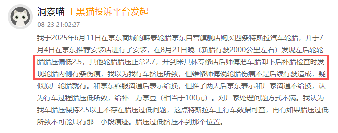 根据黑猫投诉,以“京东自营轮胎”为关键词检索得出的投诉达700多条,其中不少消费者也遇到了与王沂相似的情况――轮胎质量问题不履行售后义务、出售已老化的长期库存胎、质保期内爆胎报废不予受理、甚至有消费者自费检测证明是轮胎质量问题后平台仍拒不处理等,这类投诉的结果大多不了了之。 王沂目前只希望京东能把还未处理的三条轮胎的费用退还,也寻求了12315等投诉渠道,最终维权结果未知,但他已经不打算再信任这个平台。 (责任编辑:郭健东 )