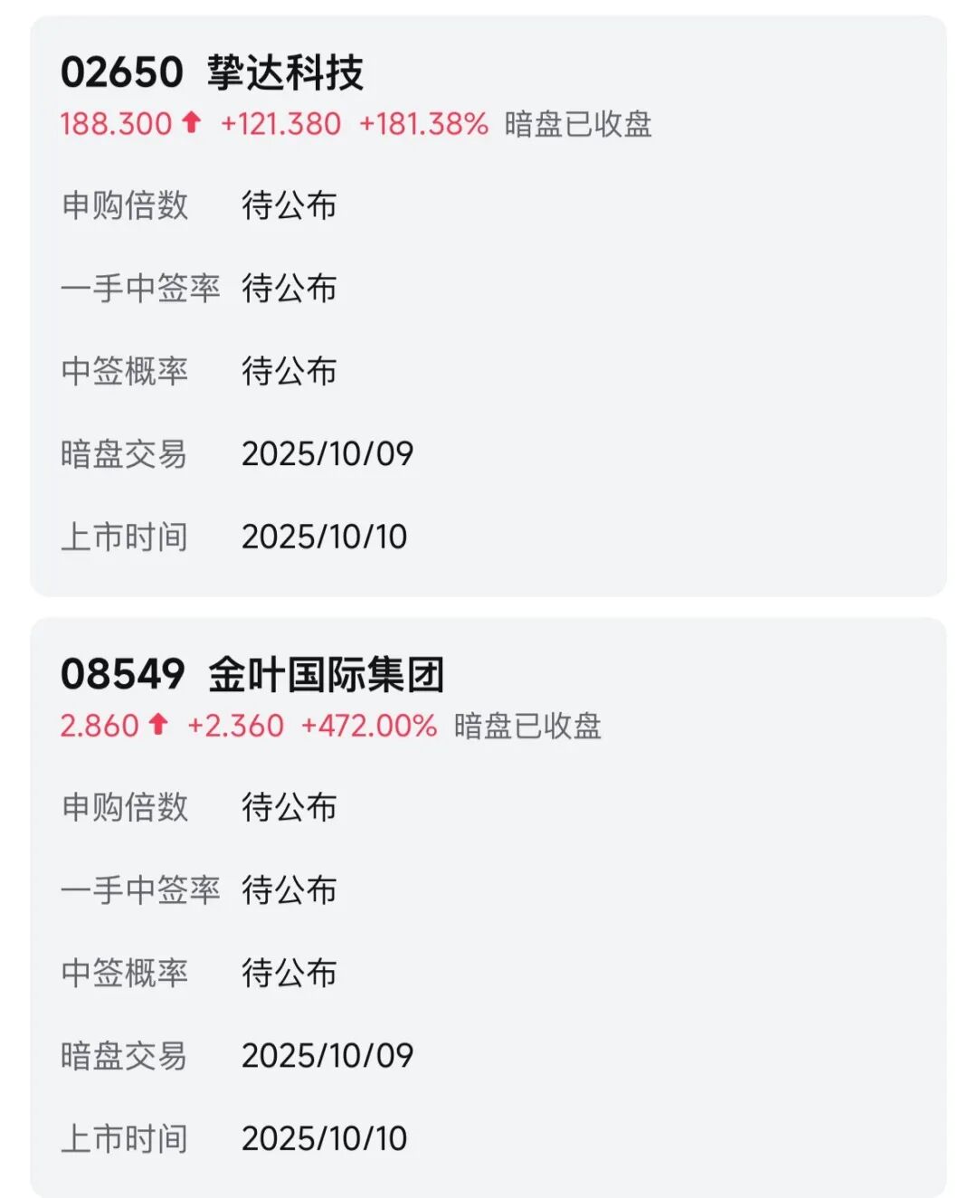 最近港股IPO的上市首日涨幅越来越高! 10月10日,又有两只新股即将正式登陆港股市场,然而在10月9日晚间的暗盘阶段,这两只新股就已经涨疯了! 富途牛牛显示,即将在明日上市的金叶国际集团,其暗盘涨幅一度达到880%,但随后涨幅有所收窄,暗盘结束时,其涨幅仍高达472%。其次是挚达科技,其涨幅也超过181%。 ![]() 值得一提的是,金叶国际集团如果能在10日正式上市时,继续保持这一涨幅,其将成为2025年以来上市首日涨幅最高的新股,而挚达科技的涨幅也能排到前4名。 金叶国际集团:上市开支占募资额超30% 金叶国际集团在暗盘能有如此表现是极为意外的,它本次选择在港股市场的GEM(创业板)上市,而GEM的定位,是为中小型公司提供一个上市的市场,这些公司相比起其他在联交所上市的公司有较高的投资风险。 招股书显示,金叶国际集团是一家从事机电工程的老牌承建商,其历史可追溯至2006年。金叶国际集团专门按个别项目基准供应、安装、保养及维修,包括暖气、通风及冷气调节系统;电力装置系统;给供水系统。 招股书显示,2023/24财年及2024/25财年各年,金叶国际集团分别承接了超过1000个项目,其中绝大部分项目(为总价项目)单个贡献的收入少于50万港元。集团承接的该等小型项目范围通常较为简单,因此通常涉及的分包费相对较低,从而带来较高的毛利率。 在具体业绩上,金叶国际集团的收益由2023/24财年约1.23亿港元大幅增加约0.32亿港元或25.6%至2024/25财年约1.55亿港元。受惠于收益大幅增加,金叶国际集团的年度溢利亦由2023/24财年约1040万港元大幅增加约370万港元或35.6%至2024/25财年约1410万港元。 事实上,由于金叶国际集团本身体量较小,盈利规模也仅有千万港元,因此本次上市对其形成了一定负担。事实上,金叶国际集团的本次上市堪称袖珍IPO。 在招股书中,金叶国际集团坦言,本次上市开支总额,即因股份发售而产生的专业费用、包销佣金及其他费用,估计约为1670万港元,占金叶国际集团股份发售估计所得款项总额的约30.4%。 金叶国际集团还预计,2025/26财年的净利润较2024/25财年大幅减少,主要是由于上市开支增加,而2024/25财年及2025/26财年的毛利预计将保持稳定,是由于2025/26财年预计收入温和增长的幅度被2025/26财年的预计毛利率下跌所抵销。 挚达科技:收入降低,持续亏损 与金叶国际集团相比,本次即将上市的挚达科技则是有着一些“科技味”了。 招股书显示,根据弗若斯特沙利文的资料,按于往绩记录期间家用电动汽车充电桩的销量及销售额计,挚达科技在中国排名第一。于往绩记录期间,按家用电动汽车充电桩销量计,挚达科技的中国市场份额达13.6%,全球市场份额达到9.0%。按中国家用电动汽车充电桩销售额计,挚达科技排名第三,市场份额约为6.6%。按2024年全球家用电动汽车充电桩销售额计,挚达科技的市场份额约为3.9%。于2024年,全球及中国的家用电动汽车充电桩市场的销售总额分别为人民币72亿元及人民币35亿元。 虽然在市场规模和份额占比上,挚达科技这些年的成绩可圈可点,但在业绩上并未有太大表现,甚至还面临着极为激烈的价格竞争。 招股书显示,2022年、2023年及2024年,挚达科技分别录得收益人民币6.97亿元、人民币6.71亿元及人民币5.93亿元,截至2024年及2025年3月31日止三个月,挚达科技分别录得收益人民币1.56亿元及人民币2.17亿元。 从上述数据不难看出,在2022年到2024年这3年间,挚达科技的收入持续降低,从一度逼近7亿元人民币,到2024年时已低于6亿元人民币。 而在利润方面,挚达科技2010年起开始营运,一直处于亏损状态。2022年、2023年及2024年,挚达科技分别产生净亏损人民币0.25亿元、人民币0.58亿元及人民币2.36亿元。截至2024年及2025年3月31日止三个月,挚达科技分别录得净亏损人民币0.32亿元及人民币0.17亿元。 可以明显看到,2024年是挚达科技亏损最为严重的一年,亏损规模达到2.36亿元人民币。 对于当前的亏损,挚达科技在招股书中表示,面对激烈的市场竞争,挚达科技正在战略性地降低价格,以扩大挚达科技的市场份额,保持挚达科技的领先地位。该做法导致价格下降和销量增加,而挚达科技的总收入亦受到该等动态因素的影响。 同时,挚达科技指出,在技术进步及商业模式创新的驱动下,中国电动汽车家庭充电解决方案市场发展迅速,竞争格局不断演变,这导致电动汽车家庭充电解决方案行业竞争对手频繁推出新产品并进行价格竞争。未来的竞争对手也可能处于更有利的位置,为挚达科技当前或未来目标市场的若干分部提供服务,这可能会造成价格压力。 因此,2024年挚达科技的毛利率大幅下降。招股书显示,2022年、2023年及2024年以及2025年3月31日,挚达科技的毛利率分别达20.4%、20.5%、14.9%及16.5%。毛利于2022年及2023年维持相对稳定,分别为20.4%及20.5%。由2023年的20.5%下降至截至2024年12月31日的14.9%主要由于市场降价压力,而挚达科技接受降价压力以维持竞争地位。 ![]() 对于后续如何盈利,挚达科技表示,公司正探索一条盈利路径,以动态收入模式和严格的成本管理为基础,使挚达科技能够在蓬勃发展的电动汽车家庭充电领域实现盈利最大化。作为市场上的重要参与者,挚达科技的首要目标是在此阶段保持韧性,击退竞争对手,占据更大的市场份额。一旦竞争格局趋于稳定,挚达科技将集中精力提高毛利率。挚达科技通过拓展至特选海外市场及零售渠道,以及开