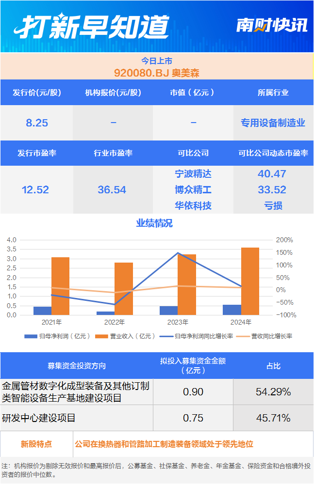 国内智能装备“隐形冠军” 美的、格力供应商今日上市丨打新早知道 全新妙想投研助理,立即体验 10月10日,有一只新股上市,为北交所的奥美森(920080.BJ)。该公司是专业的智能装备制造生产商,主要从事智能生产设备及生产线的研发、设计、生产、销售,公司产品可广泛应用于电器、环保、风电和锂电新能源及其他行业等领域,是实现生产自动化、智能化和高效化的关键装备。 ![]() 招股书显示,奥美森自2003年成立以来,深耕热交换和管路加工技术,目前公司的主要产品包括换热器生产智能设备、管路加工智能设备和其他定制智能设备(环保设备、锂电池热压整形设备和风电叶片根部数控铣削机等)。 技术储备上,奥美森作为牵头单位完成的“换热器成套装备数字化设计制造关键技术及应用”项目于2020年8月经广东省机械工程学会鉴定达到国际先进水平、“一体化数控管道加工关键技术及装备研究与产业化”项目于2016年5月经中山市科学技术局鉴定达到国内领先水平;公司参与的“基于细径管换热的高效空调器设计与制造关键技术及产业化”项目于2018年12月经中国轻工业联合会鉴定达到国际领先水平。 客户资源方面,经过多年的行业积累与发展,奥美森的产品在空调生产制造装备领域名列前茅,与国内外主要电器生产企业如格力电器、美的集团、奥克斯、海信家电、TCL家电、四川长虹、大金空调、松下电器、江森自控、特灵、开利、富士通将军、三菱重工海尔等保持长期稳定合作关系。奥美森被认为是国内智能装备“隐形冠军”。 除了传统产品外,奥美森还积极拓展至环保、风电和锂电新能源及其他行业领域,代表性产品如垃圾衍生燃料SRF/RDF生产线成套设备、锂电池热压整形设备、风电叶片根部数控铣削机等。 目前,奥美森环保、新能源等其他各行业领域的智能装备已得到中国电建、盈峰环境、理文造纸、博世科、荣成环保、明阳智能、中山公用、誉辰智能、比亚迪等客户认可并实现签约销售。 不过,尽管新业务拓展已取得一定成绩,但奥美森仍在招股书中提示,公司可能存在业务拓展失败的风险。奥美森表示,公司以产业发展趋势为导向,将环保、风电和锂电新能源行业作为未来拓展的下游应用领域。如因环保、风电和锂电新能源行业等应用领域的客户资源壁垒或技术验证不及预期等,导致公司短期内无法进入客户的供应商体系,将导致公司为进入新领域进行的研发投入、销售投入等无法收回,从而为公司经营业绩带来不利影响。 此外,2022年至2024年间,奥美森计入当期损益的政府补助金额分别为766.59万元、655.16万元和209.47万元,占当期利润总额的比例为41.28%、12.08%和3.31%。奥美森提醒称,如果未来政府对公司所处行业的政策支持力度减弱,公司取得的政府补助金额将会有所减少,将对公司未来的经营业绩产生一定影响。 (文章来源:21世纪经济报道) |