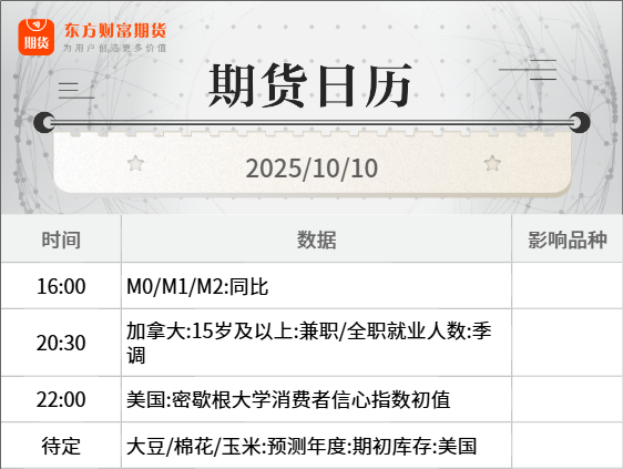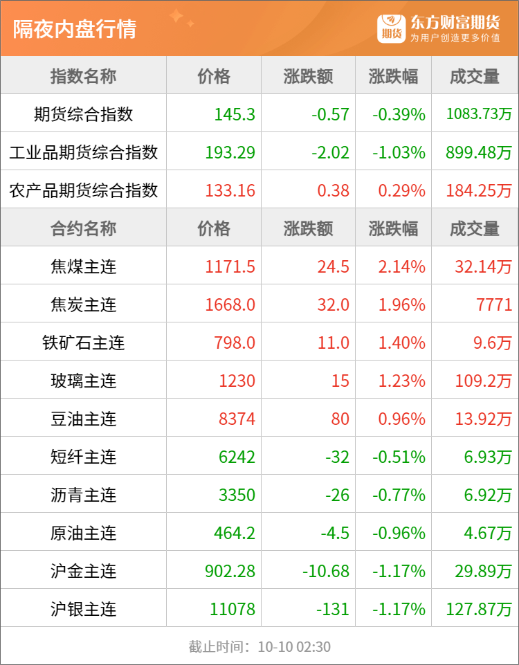 隔夜行情![]() ![]() 每日精选白银凶猛!年内涨幅已超70% 金银比显示估值仍低 印尼暂停190项矿业经营许可影响有限 ESG合规或成关注焦点 黄金缘何彻底爆发?答案就在六个字:货币贬值交易! 宏观产经澎湃新闻:10月9日,外交部发言人郭嘉昆主持例行记者会。BBC记者提问称,中方是否会派员前往韩国参加APEC非正式领导人会议?中方领导人是否会在APEC期间同美国总统特朗普进行会晤?郭嘉昆表示,中方高度重视亚太经合组织的合作,愿同各方一道推动今年的会议取得积极成果,助力亚太和世界的经济增长。“关于你提到的具体问题,我目前没有可以提供的信息。” 国家发改委:国家发展改革委、市场监管总局近日发布关于治理价格无序竞争维护良好市场价格秩序的公告。 财联社:商务部、海关总署连发4则公告,对超硬材料、部分稀土设备和原辅料、部分中重稀土、锂电池和人造石墨负极材料等相关物项实施出口管制。 品种资讯黑色系期货 螺纹钢:截至10月9日当周,建材产量454.86万吨,周环比减少18.08万吨;厂库488.16万吨,周环比增加54.81万吨;社库572.12万吨,周环比增加25.62万吨;表需374.43万吨,周环比减少148.03万吨。(找钢网) 铁矿石:9月中旬起,河北唐山地区再度实施环保限产政策,执行期将持续至10月20日。据调研了解,节前限产政策执行相对宽松;但进入假期及节后阶段,随着环保限产持续推进,多数钢厂烧结机限产力度进一步加严,限产比例由30%提升至40%-50%。此外,受运输限制影响(晚6点至早8点仅允许新能源车通行),部分钢厂反馈虽然已经在节前提前储备铁矿石,但现有库存恐难以维持至20日限产结束。若运输限制持续,原料供应紧张可能进一步导致部分钢厂高炉停炉或降低生产负荷。(SMM) 焦煤:本周,Mysteel统计523家炼焦煤矿山样本核定产能利用率为81.9%,环比减4.6%。原煤日均产量183.9万吨,环比减10.3万吨,原煤库存446.4万吨,环比增2.5万吨 ,精煤日均产量75.2万吨,环比减2.2万吨,精煤库存195.9万吨,环比增4.3万吨。(Mysteel) 农产品期货 生猪:国家级生猪大数据中心监测显示,2025年10月9日,31个省(自治区、直辖市)外三元生猪价格0涨27跌4平,呈下跌趋势。价格监测情况显示,当日全国生猪均价为11.67元/公斤,较前一日下跌0.20元/公斤。外三元生猪价差监测显示,9日全国21组大区间平均价差约0.56元/公斤,较昨日持平,低于平均调运成本0.49元/公斤。(新华财经) 棉花:国家发改委发布2026年棉花进口关税配额申请和安排细则,其中,2026年棉花进口关税配额总量为89.4万吨,其中33%为国营贸易配额。配额不限定贸易方式,由企业自行确定。(国家发改委) 棕榈油:印尼能源与矿产部长表示,由于在2026年实施B50生物柴油计划,预计印尼明年将无需进口柴油。(财联社) 大豆:据外媒报道,巴西全国谷物出口商协会(Anec)公布的数据显示,上周(9月28日-10月4日)巴西出口1488130吨大豆、511617吨豆粕、1624181吨玉米。本周(10月5日-11日)计划出口2233095吨大豆、559196吨豆粕、1598108吨玉米。(新华财经) 有色/贵金属期货 沪银:现货白银价格加速上涨,历史首次突破50美元/盎司,今年已累计上涨73%。(财联社) 沪铜:截至10月9日,国内市场电解铜现货库存16.79万吨,较9月29日增1.12万吨。其中,上海库存下降1.16万吨,广东、江苏两地库存分别增加0.82万吨和1.15万吨。(Mysteel) 碳酸锂:2025年9月智利出口碳酸锂1.59万吨,同环比分别-13%/-6%,出口均价8704美元/吨,同环比分别+15%/+2%;其中出口至中国的量1.11万吨(环比减少1881吨,环比-14%)。2025年1-9月智利共计出口碳酸锂16.47万吨,同比-8.5%(减少1.53万吨),其中出口至中国的量12.09万吨,同比-17%(减少2.39万吨)。(上海有色网) 多晶硅:据Mysteel数据显示,9月中国主流多晶硅企业多晶硅产量为13.45万吨,环比上涨4.38%,同比下降2.68%。据Mysteel预计,10月份多晶硅排产在14.25万吨左右,环比上涨5.95%。9月多晶硅国内企业产能开工率在47.24%,与8月相比上涨2%。据Mysteel预计,10月份多晶硅开工率在50.05%,环比上涨3.7%。(我的钢铁网) 能化期货 玻璃:截止到10月9日,全国浮法玻璃样本企业总库存6282.4万重箱,环比增加346.9万重箱或5.85%,处于4周高位,同比增加6.76%,折库存天数26.7天,较上期增加1.3天。(隆众资讯) 乙二醇:截至10月9日,华东主港地区乙二醇(MEG)库存总量44.31万吨,较上一期增加8.8万吨,涨幅24.8%。发货方面,假期内张家港日均发货2700吨左右;太仓两库综合日均发货3400吨;宁波港口日均发货2200吨。(隆众资讯) 烧碱:截至10月9日,全国20万吨及以上固定液碱样本企业厂库库存42.12万吨(湿吨),环比上调7.68%,同比上调26.56%。本周全国液碱样本企业库容比23.41%,环比上涨2.63%。(隆众资讯) 纯碱:截止到2025年10月9日,国内纯碱厂家总库存165.98万吨,较节前(9月29日)涨幅5.99万吨,涨幅3.74%。其中,轻质纯碱73.91万吨,环比上涨4.24万吨,重质纯碱92.07万吨,环比增加1.75万吨。(隆众资讯) 其他期货 欧线集运:马士基表示,一旦建立长期且可行的安全解决方案,将考虑恢复经由红海的运输。(财联社) 环球视野财联社:因美国政府“停摆”进入第二周,美国上周初请失业金人数、初请失业金人数四周均值、续请失业金人数因美国政府停摆未能如期公布。 新华财经:据美国财政部最新数据,截至10月7日,美国联邦债务总额为37.89万亿(四舍五入)美元,比10月初增加了256亿美元,按照这个递增速度,美国联邦债务总额或在11月6日前后触及38万亿美元大关。 每日关注![]() (