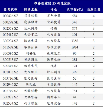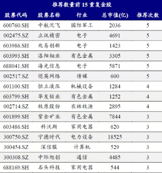 有色金属增配居前 行业方面,国信证券研报指出,在对券商金股股票池进行去重后,从绝对占比来看,券商10月金股在电子、机械、有色金属、电力设备及新能源、基础化工等行业配置较高。 开源证券研报统计结果也显示,10月券商金股权重最靠前的行业为电子,且占比高达15.4%;电力设备紧随其后,占比为10.2%;有色金属、机械设备位居其次,占比分别为8.9%、6.3%。 行业的权重增减方面,多家券商研报数据均显示,有色金属是10月券商金股中权重增加最为明显的板块。 国信证券数据显示,相较今年9月,10月券商金股增加最多的行业分别为有色金属、电力设备及新能源、汽车,增幅分别为2.71%、2.64%、1.19%。 开源证券研报数据指出,从相对变化来看,券商10月金股在电力设备、有色金属、轻工制造等行业的增配较多,分别增加了3.9%、2.9%、1.2%。 降幅方面,国信证券和开源证券数据均显示,10月券商金股对非银金融板块的减配较多。 开源证券数据显示,10月金股权重减少最多的行业分别为非银金融、计算机、通信,分别减少了3.4%、2.2%、1.6%。国信证券数据显示,非银金融、医药、食品饮料分别减少了3.08%、1.79%、1.66%。 “2025年10月份券商金股的市值水平下降,估值水平上升,或表明10月份券商金股转向成长风格。”开源证券称。 ![]() 洛阳钼业等6股最热 个股层面,开源证券数据显示,10月各家券商推荐的金股中,中航沈飞(600760)、立讯精密(002475)、兆易创新(603986)、洛阳钼业(603993)、海光信息(688041)、恺英网络(002517)等6只股票,被推荐次数最靠前,合计均被推荐了5次。 恒立液压(601100)、华友钴业(603799)、牧原股份(002714)等均被推荐了4次。 紫金矿业(601899)、科沃斯(603486)、宁德时代(300750)、深信服(300454)、中际旭创(300308)、石头科技(688169)等则被推荐了3次。 ![]() 而在10月新进金股(相对2025年9月新进金股名单)中,兴业银锡(000426)被推荐次数最多,合计被推荐了4次。 安琪酵母(600298)、巨人网络(002558)、大金重工(002487)、阳光电源(300274)等,合计均被推荐了3次。 华泰证券(601688)、利安隆(300596)、贝达药业(300558)、云意电气(300304)、太阳纸业(002078)、塞力医疗(603716)、新乳业(002946)、天赐材料(002709)、天秦装备(300922)、西子洁能(002534)等,均分别被推荐了2次。 ![]() 落实到各个热门行业方面,电子板块的最热金股为兆易创新、立讯精密、海光信息,合计均被推荐了5次。电力设备板块为阳光电源、大金重工、宁德时代,合计均被推荐了3次。有色金属板块最热的是洛阳钼业,合计被推荐了5次。 机械设备板块为恒立液压,合计被推荐4次;汽车板块则是云意电气,合计均被推荐了2次。 其他热门行业上,计算机板块中深信服被推荐次数最多,医药生物板块乐普医疗、贝达药业、塞力医疗、联影医疗等热度最高,通信板块中兴通讯、中际旭创被推荐次数最多,基础化工板块卫星化学、利安隆、巨化股份的推荐次数并列第一,传媒板块恺英网络最被关注,国防军工板块中航沈飞热度最高,食品饮料板块中安琪酵母推荐数最多。 ![]() 市场人士称,在券商金股股票池中,如果前期市场的关注度相对较少,随着券商分析师将其推荐为金股,其获得的市场关注度将会明显提升。基于此,可寻找出市场前期关注度相对较少的券商金股。 “一定程度上,大部分券商在每月初披露的十大金股中体现了分析师的一致预期。同时,券商金股还兼具了量化分析系统吸收基本面研究的前瞻性。”不过,沪上某券商金融工程首席分析师进一步指出,“随着市场对券商金股关注度的提升,投资者想在券商金股组合中获得更多超额收益,仍需要对券商金股进行进一步优选。” (文章来源:澎湃新闻) |
