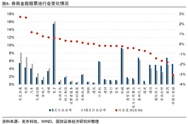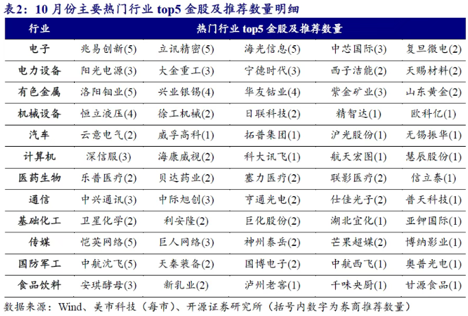 “十一”假期后的首个交易日,A股迎来“开门红”。各大券商在10月更加青睐哪些板块和标的呢? 整体来看,行业方面,10月金股中电子仍是权重占比最高的行业。而从相对变化看,有色金属是10月金股中增配最多的行业。非银金融则在券商10月金股中权重下降最大。 具体到个股方面,开源证券研报数据显示,根据全市场41家券商发布的金股去重统计后,中航沈飞(600760)、立讯精密(002475)、兆易创新(603986)、洛阳钼业(603993)、海光信息(688041)、恺英网络(002517)等6只股票的热度最高,合计被各家券商10月金股推荐的次数最多。