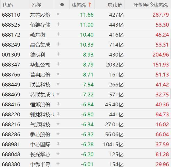 格隆汇10月10日|A股市场芯片股集体重挫,其中,东芯股份、佰维存储跌超11%,燕东微、晶合集成跌超10%,德明利、华虹公司、普冉股份跌超8%,联芸科技、芯联集成跌超7%,恒烁股份、翱捷科技、气派科技、敏芯股份、中芯国际、长光华芯、中微半导跌超6%,中芯国际跌超5%。