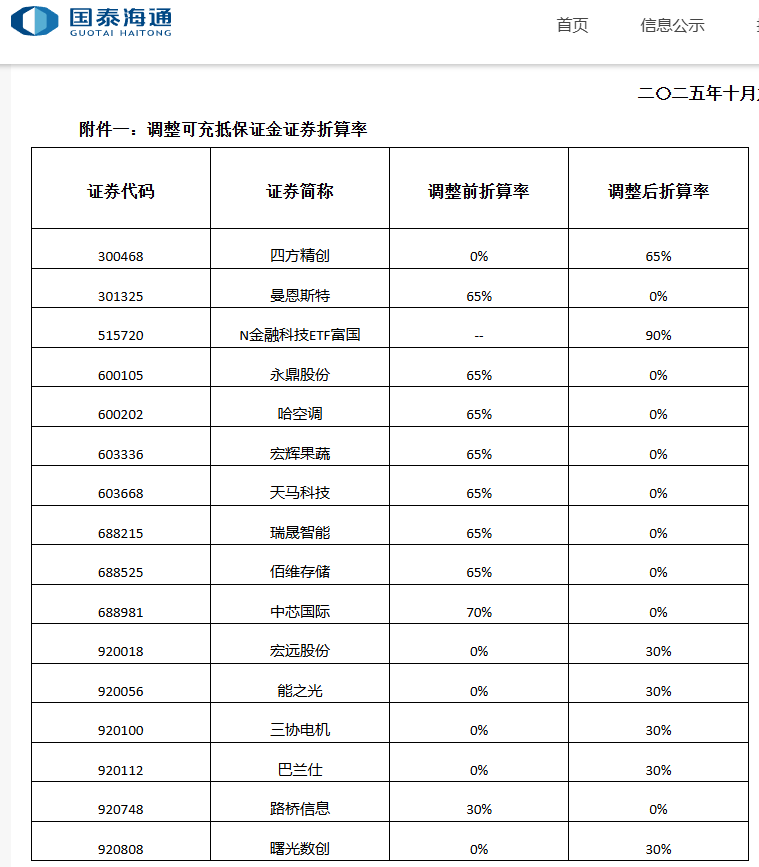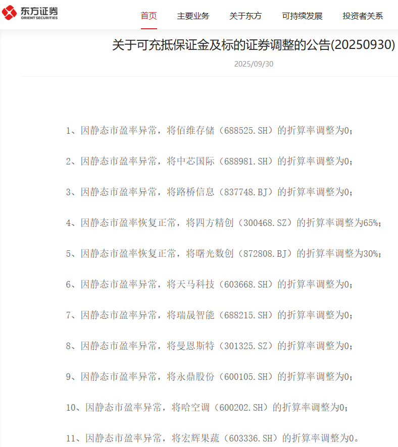 10月9日,有投资者称接到东方财富证券短信告知,自10月9日起其信用账户持有的中芯国际(688981)的折算率由0.70调整为0.00;佰维存储(688525)的折算率也由0.50调整为0.00。由于周四(10月9日)早盘大涨的中芯国际,午后股价出现大幅跳水。因此,其融资融券折算率的调整消息成为市场关注热点。 澎湃新闻记者10月9日查阅东方财富证券官网发现,中芯国际、佰维存储的折算率确已调整为0.00%。 股票的融资融券折算率为何调整为零?是否是个别券商情况?融资融券折算率是什么,又会在什么情况下会进行调整呢? 对此,澎湃新闻记者向多家券商进行了解,而各券商的回复基本一致,称对相关标的融资融券折算率调整为零,是根据交易所规定,因静态市盈率异常进行的调整,属常规操作。 “融资融券交易实施细则有规定,静态市盈率在300倍以上或者为负数的A股股票,折算率为0%。”有券商人士对澎湃新闻记者解释称。 同时,该券商人士进一步指出:“各家调整都一样,且一般都会发公告。” 记者查询国泰海通证券官网信息显示,10月9日共有9只股票的可冲抵保证金折算率调整为零。 具体来看,曼恩斯特(301325)、永鼎股份(600105)、哈空调(600202)、宏辉果蔬(603336)、天马科技(603668)、瑞晟智能(688215)、佰维存储(688525)的折算率,均由65%调整为0%。 中芯国际(688981)的折算率则由70%调整为0%。路桥信息(920748)的折算率,则由30%调整为0%。 ![]() 无独有偶,东方证券在官网公布的《关于可充抵保证金及标的证券调整的公告(20250930)》显示,自2025年10月9日生效的调整中,同样将佰维存储、中芯国际、路桥信息、天马科技、瑞晟智能、曼恩斯特、永鼎股份、哈空调、宏辉果蔬等9股的折算率调整为零。 同时,东方证券在公告中指出,对上述9股的折算率调整为0,均因静态市盈率异常。 ![]() “对可冲抵保证金证券折算率进行调整,一是因长期停牌、长期停牌复牌或特别处理等,调整部分证券折算率水平,二是根据交易所要求调整可充抵保证金证券折算率。”有券商人士称。 该券商人士强调,折算率调整是一种常态化操作,随着相关股票静态市盈率的恢复正常,其折算率也会再次调整。 Wind数据显示,9月30日收盘后,中芯国际的市盈率为303.08%;截至10月9日收盘,中芯国际的市盈率为300.44%。 国信证券发布的信息显示,折算率是指在计算保证金金额时,投资者提交的作为充抵保证金的证券按其证券市值或净值折算为保证金的比率。 其中,交易所规定的折算率上限共分95%、90%、80%、70%、65%、0%六类。 具体而言,证券公司现金管理产品、货币市场基金、国债的折算率上限为95%;交易型开放式指数基金为90%;其他上市证券投资基金和债券为80%;深证100指数、上证180指数和北交所指数成份股股票为70%;其他A股股票为65%。 而被实施风险警示、进入退市整理期的证券,静态市盈率在300倍以上或者为负数的A股股票,以及权证为0%。 ![]() 通俗而言,国信证券举例称:假设证券A在公布的可充抵保证金证券名单内,折算率为65%。投资者开立信用账户后转入了100万元现金和100万元市值的证券A,那么此时投资者信用账户的保证金金额=100万元(现金)*100%+100万元(证券A)*65%=165万元。 据悉,2016年12月2日,沪深交易所发布联合公告,经证监会批准,两家交易所对《融资融券交易实施细则》进行了修订,调整可充抵保证金证券折算率要求,将静态市盈率在300倍以上或者为负数的股票折算率下调为0%。 2023年修订的《融资融券交易实施细则》第三十六条指出,可充抵保证金的证券,在计算保证金金额时应当以证券市值或净值按下列折算率进行折算。 一是上证180指数成份股股票的折算率最高不超过70%,其他A股股票折算率最高不超过65%;二是交易型开放式指数基金折算率最高不超过90%;三是证券公司现金管理产品、货币市场基金、国债折算率最高不超过95%;四是被实施风险警示、进入退市整理期的证券,静态市盈率在300倍以上或者为负数的A股股票,以及权证的折算率为0%;五是其他上市证券投资基金和债券折算率最高不超过80%。