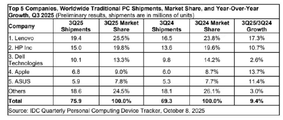 丁冬科技讯 10月10日中午消息,根据国际数据公司(IDC)《全球季度个人计算设备追踪报告》发布的初步结果显示,2025年第三季度,全球传统个人电脑(包括台式机、笔记本电脑和工作站)市场出货总量达到7590万台,相较于去年同期(6930万台)增长了9.4%。
