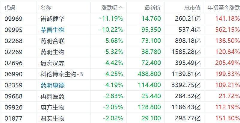 格隆汇10月10日|延续昨日跌势,港股生物医药股今日继续回调。其中,诺诚健华跌超11%,荣昌生物跌超10%,药明合联、药明生物跌超5%,复宏汉霖、科伦博泰生物、药明康德(603259)跌超4%。