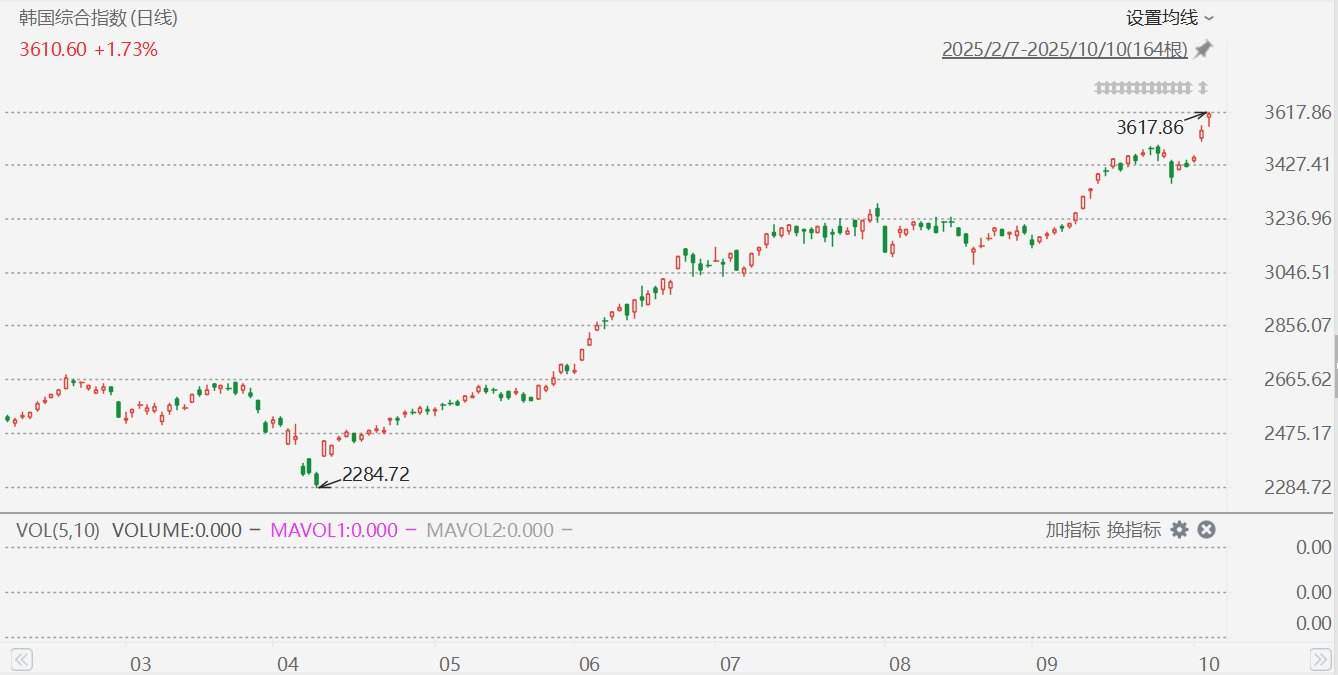 格隆汇10月10日|韩国综合指数盘初一度涨1.93%报3617.86点,再创历史新高;最终收涨1.73%报3610.6点,再创收盘历史新高。韩国综合指数年内累涨50.47%。