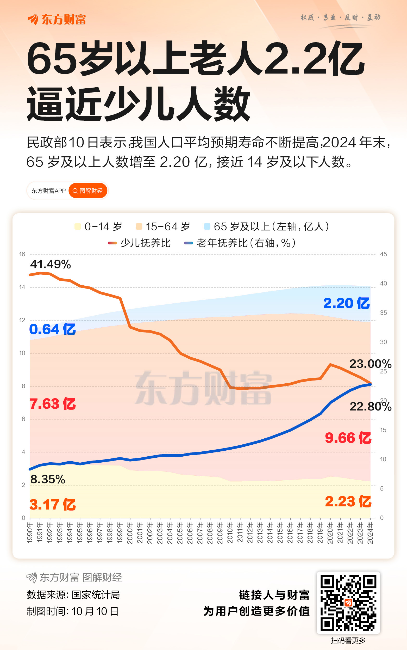 ![]() 今日(10月10日)国新办发布会上,民政部表示,“十四五”期间,我国人口预期寿命不断提高,达到79岁,比世界平均水平高了5岁。随着人均预期寿命的提高,我国人口老龄化程度也在不断加深,截至2024年底,我国65周岁及以上老年人口2.2亿,占总人口的15.6%。 国家统计局数据显示,1990年至2024年,0-14岁人口从3.17亿降至2.23亿;15-64岁人口从7.63亿增至9.66亿,65岁及以上老年人口从0.64亿增至2.20亿。从抚养比来看,35年间总抚养比从49.84%降至45.80%,其中少儿抚养比从41.49%降至23.00%,老年抚养比从8.35%升至22.85%,二者几乎持平。 根据国家统计局口径,0-14岁为少儿人口、15-64岁为劳动年龄人口,65岁及以上为老年人口。因此老年抚养比是指老年人口数与劳动年龄人口数之比。相对应的,还有少儿抚养比,指少年儿童人口数与劳动年龄人口数之比,用来反应社会养育负担。 关于老年抚养比的上升,中国人口学会副会长原新表示,当社会进入人口负增长时期后,随着每年新增人口的减少,老龄化的过程加剧,老年抚养比这一数字还将继续上升且很难逆转。 但同时他也表示,“数字上升并不可怕,关键是我们是否能够做到‘边备边老’。”原新建议,应对老龄社会问题,不仅在宏观层面上要继续促进经济的可持续发展,为应对人口老龄化提供足够的财富积累;此外,还要将现有资源进行合理分配,对于不同情况的老年人提供更加精细化的养老、助老服务。