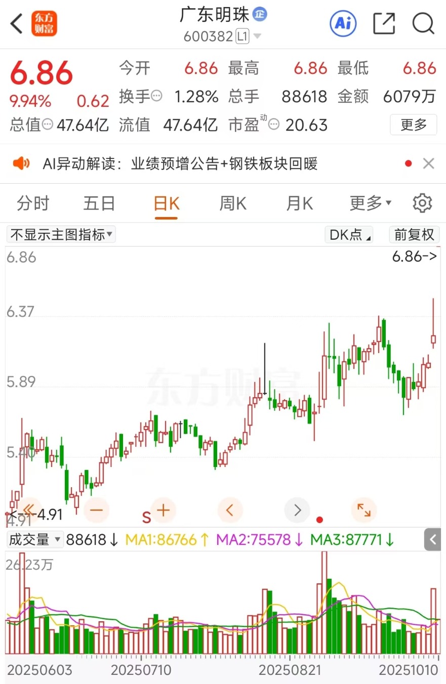 在A股三大指数集体回调,创业板指一度跌超5%的背景下,有一类股却在10月10日集体狂飙,那便是三季报业绩预增股。 比如广东明珠,该股10月10日一字板涨停,收盘时封单金额为1.78亿元。该股10月9日披露的三季报业绩预告显示,预计前三季度实现归母净利润为2.15亿元~2.63亿元,同比增长858.45%~1071.44%;预计实现归母扣非净利润2.15亿元~2.63亿元,同比增长428.49%~545.93%。 资料显示,广东明珠主要从事铁矿石的开采、销售和建筑石料的加工、销售业务。而三季度业绩预增,主要系全资子公司广东明珠集团矿业有限公司(下称“明珠矿业”)经营业绩同比增加的影响。数据显示,前三季度明珠矿业铁精粉销量同比增加约212.49%,归母净利润预计将达到2.44亿元~2.98亿元,同比增长约280.43%~364.98%。 ![]() 业绩预增股表现亮眼 事实上,10月9日晚披露三季报业绩预告的9家公司,多数在10月10日上涨,其中业绩预增股更为亮眼。 同样业绩预增的涛涛车业,在10月10日大涨8.83%。该股10月9日披露的三季报业绩预告显示,前三季度预计实现归母净利润5.80亿元~6.20亿元,同比增长92.46%~105.73%;实现归母扣非净利润5.75亿元~6.15亿元,同比增长94.97%~108.54%。 还有利民股份,该股10月10日大涨7.04%。10月9日该股披露的三季报业绩预告显示,前三季度预计实现归母净利润3.84亿元~3.94亿元,同比增长649.71%~669.25%;扣非归母净利润为3.7亿元~3.81亿元,同比增长994.97%~1026.92%。 此外,北摩高科、广大特材、金力永磁也在披露业绩预增公告的翌日股价表现强势,10月10日分别逆市上涨4.22%、2.48%和0.99%。 ![]() 预增股上涨多有持续性 不止是最新披露的业绩预增股表现强势,皖维高新(+5.1%)、兄弟科技(4.98%)、中泰股份(+5.79%)等此前披露的业绩预增股也在10月10日纷纷走强。 拉长时间来看,业绩预增股的股价表现具有明显的持续性,比如9月22日披露业绩预增公告的长川科技,翌日该股20CM涨停,截至10月10日收盘已累计大涨41.65%。兄弟科技也在业绩预增公告的翌日股价涨停,此后继续震荡上行,迄今累计涨幅为18.36%。中泰股份亦是如此,披露业绩预增公告后已累计大涨31.32%。 ![]() 又有个股发布预增公告 而在10月10日盘后,至截稿时,有研新材也发布了三季度业绩预增公告。数据显示,该股前三季度实现归母净利润2.3亿元~2.6亿元,同比增长101%~127%;扣非归母净利润为1.55亿元~1.7亿元,同比增长62%~78%。有研新材表示,公司本报告期业绩增长的原因在于控股子公司靶材销售收入同比大增以及公司前三季度公司开展科技成果转化并实现重大非经常性收益。 还有全志科技、川金诺、华测导航、北方稀土、黔源电力也在10月10日盘后发布了业绩预增公告,其中川金诺、北方稀土预计前三季度归母净利润同比至少翻倍。而在这些个股吧,总能看到下周一股价要大涨的言论。 机构看重三季报行情 根据沪深交易所的安排,金岭矿业和道氏技术预计在10月10日盘后正式披露三季报。下周(10月13日-10月18日)将有65股陆续披露三季报。 往后看,不少机构表示,10月行情有望围绕三季报展开。兴业证券认为,10月市场进入三季报交易窗口,这有望带动资金聚焦景气线索,成为“破局”的重要抓手。对于以科技、先进制造为代表的强势板块,三季报是验证其景气周期的重要窗口。 中信建投研报也表示,经济逐步改善+流动性宽松+风险偏好维持高位,预计10月市场仍将震荡向上。参照历史股市10月轮动经验,预计市场行情有望围绕三季报展开,建议投资者积极关注三条线:三季报业绩较好(业绩出现拐点)的方向、受益于反内卷政策落地逐步改善的周期方向和产业趋势超预期的高成长相关行业。 招商证券、东海证券也均在近期的研报中表达了三季报的重要性,前者表示三季报将是10月的关键看点,而后者认为三季报窗口期将是10月的主线之一,可关注业绩可能超预期的板块,如券商、半导体等。