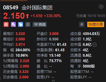 金叶国际集团上市首日涨330%。据此前消息,上一交易日,金叶国际集团暗盘一度暴涨900%,最高涨至5.00港元;最终暗盘收涨472%,报2.86港元。每手5000股,不计手续费,一手赚11800港元。公开发售阶段金叶国际集团获11464.72倍认购,公开发售的发售股份最终数目为1000万股份,占发售股份总数的约10%。合共接获约16.81万份有效申请,受理申请数目2000份,申购一手获配发股份占所申请股份总数的概约百分比为0.50%。此外,国际配售阶段金叶国际集团获1.20倍认购,国际发售股份最终数目为9000万股股份,相当于发售股份总数的90%。