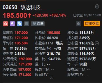 挚达科技上市首日涨超192%。据此前消息,上一交易日,挚达科技暗盘收涨181.38%,报188.3港元。每手50股,不计手续费,一手赚6069港元。另据此前消息,公开发售阶段挚达科技获5440.80倍认购,公开发售的发售股份最终数目为59.79万股份,占发售股份总数的约10%。合共接获约20.18万份有效申请,受理申请数目11958份,申购一手获配发股份占所申请股份总数的概约百分比为0.04%。此外,国际配售阶段挚达科技获2.37倍认购,国际发售股份最终数目为538.10万股股份,相当于发售股份总数的90%。