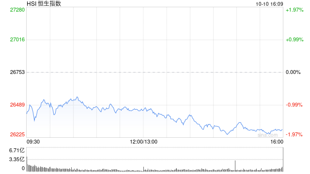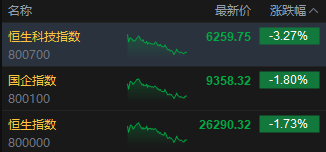10月10日消息,港股三大指数低开低走。截至收盘,恒生指数跌1.73%,报26290.32点,恒生科技指数跌3.27%,国企指数跌1.80%。盘面上,科网股普跌,百度、快手跌超5%,阿里巴巴跌超4%,腾讯、哔哩哔哩跌超3%,京东、小米、联想跌超2%,美团、网易跌超1%;茶饮股普涨,古茗涨超12%;建材水泥股活跃,中国天瑞水泥涨超12%;黄金股普跌,中国黄金国际跌超9%;金叶国际集团上市首日涨330%,挚达科技涨超192%。