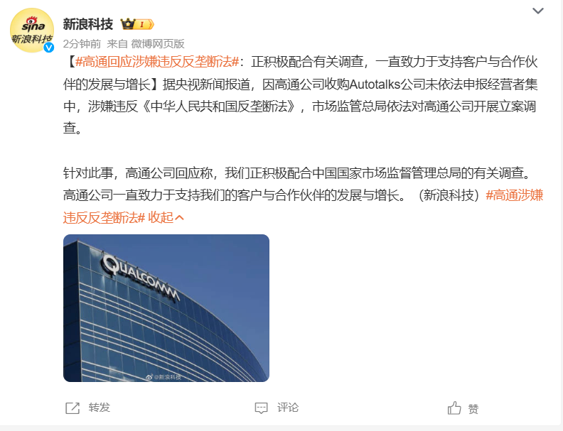 据央视新闻报道,因高通公司收购Autotalks公司未依法申报经营者集中,涉嫌违反《中华人民共和国反垄断法》,市场监管总局依法对高通公司开展立案调查。针对此事,高通公司回应称,我们正积极配合中国国家市场监督管理总局的有关调查。高通公司一直致力于支持我们的客户与合作伙伴的发展与增长。