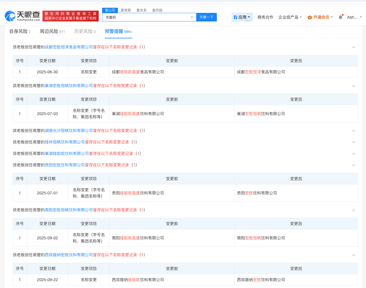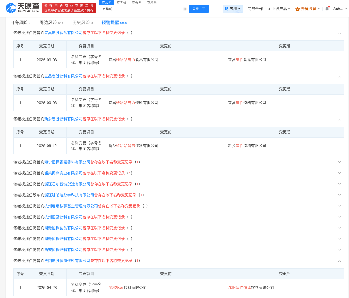 宗馥莉辞任娃哈哈集团法定代表人、董事长前夕,多地关联公司更名为“宏胜”。 ![]() 娃哈哈旗下多家公司9月更名为宏胜。 天眼查信息显示,9月以来,多家原名与娃哈哈有关的公司发生工商变更,企业名称变更为宏胜,宗馥莉均在上述公司担任高管。例如,9月22日“西双版纳娃哈哈饮料有限公司”更名为“西双版纳宏胜饮料有限公司”。9月8日“宜昌娃哈哈启力饮料有限公司”更名为“宜昌宏胜饮料有限公司”。9月2日,“南阳娃哈哈昌盛饮料有限公司”更名为“南阳宏胜恒枫饮料有限公司”等。此外,今年以来已有超十家娃哈哈旗下公司发生工商变更,企业名称变更为宏胜,包括杭州宏胜恒泽饮料有限公司、白山宏胜饮料有限公司等。 ![]() 今年以来已有超十家娃哈哈旗下公司发生工商变更,企业名称变更为宏胜。 关联公司密集更名“去娃哈哈化”之前,已经在股东、董监高层面进行过调整。 以宜昌宏胜饮料有限公司为例。根据天眼查信息,2024年6月,祝丽丹接替宗庆后出任该公司法定代表人;郭虹卸任监事,方永清卸任经理,接任者分别是宗馥莉嫡系严雪峰、祝丽丹。 2025年1月,宜昌宏胜饮料有限公司的投资人也出现变更。杭州娃哈哈启力食品集团有限公司退出股东名单,以同等认缴出资额新进的股东则是丽水宏博饮料有限公司。 需要指出的是,杭州娃哈哈启力食品集团有限公司和丽水宏博饮料有限公司的法定代表人均为宗馥莉。而且,天眼查信息显示,穿透之后,杭州娃哈哈启力食品集团有限公司的实际控制人也是宗馥莉。这也意味着,这场更名调整的背后,更多的还是公司名称上的“去娃哈哈化”,而非实际控制权的转移。 而南阳宏胜恒枫饮料有限公司的股东结构并未调整,控股股东至今仍为浙江娃哈哈昌盛饮料集团有限公司,只是在2024年7月的那场董监高更迭中,宗馥莉、严雪峰、祝丽丹新进为该公司董监高。 一系列关联公司更名引发外界关注的背后,是娃哈哈集团管理层的这波调整。 10月10日,澎湃新闻记者从知情人士处获悉,宗馥莉已于9月12日向娃哈哈集团有限公司辞去公司法定代表人、董事及董事长等相关职务,并已通过集团股东会和董事会的相关程序。 国家信用信息公示系统显示,目前,杭州娃哈哈集团有限公司还未发生变更,法定代表人依然是宗馥莉,最近一次变更日期仍停留在2024年8月29日,当时涉及高级管理人员备案、负责人变更、投资人变更等,包括负责人由宗庆后变更为宗馥莉。 杭州娃哈哈集团有限公司创建于1987年,从3个人、14万元借款起家,发展成为全球领先的食品饮料生产企业之一,是中国企业500强、中国民营企业500强。公司最大股东为杭州市上城区文商旅投资控股集团有限公司,持股46%,宗馥莉持股29.4%,杭州娃哈哈集团有限公司基层工会联合委员会(职工持股会)持股24.6%。杭州市上城区文商旅投资控股集团有限公司为上城区国有资本运营集团有限公司全资子公司,上城区国有资本运营集团有限公司由区财政局100%控股。 2024年2月,娃哈哈创始人宗庆后去世,关于娃哈哈集团的走向引发外界关注。宗馥莉是宗庆后之女。去年7月,宗馥莉曾请辞娃哈哈集团副董事长、总经理职务,不再参与其经营管理。之后,娃哈哈集团又发布声明称,为确保公司的平稳健康发展,经各股东友好协商,宗馥莉女士决定继续履行娃哈哈集团的相关管理职责。娃哈哈还表示,感谢近期社会各界和媒体的关注,并对占用媒体资源表示歉意。 值得关注的是娃哈哈集团背后的商标之争,据澎湃新闻记者了解,在现行股权架构下,“娃哈哈”商标的使用,须获得娃哈哈集团全体股东的一致同意,否则任何一方均无权使用。