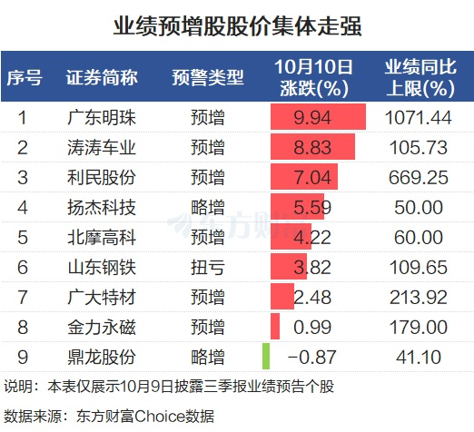 随着10月底三季报披露期临近,业绩交易窗口期开启,未来一段时间,绩优股势必成为市场关注的焦点。10月10日晚间,金岭矿业、道氏技术率先发布2025年三季报,此外,还有40余家上市公司已发布三季报预告,本文就为投资者梳理一下目前已披露三季报预告或报告的个股情况,对接下来行情的参与提供一定的参考。 ![]() 上表按净利润变动中值排序列出了已披露三季报预告或报告的个股情况,其中英联股份2025年前三季度净利润预计同比增长1531.13%–1672.97%暂居首位,此外广大特材、永和股份、兄弟科技、北方稀土、利民股份、广东明珠等个股前三季度净利预增超200%。 从行业来看,多家半导体行业的上市公司净利润与净利润增幅均排名靠前,半导体设备环节的长川科技预计2025年前三季度归母净利润同比增长131.39%至145.38%,半导体材料环节的有研新材预计前三季度归母净利润同比增长最高达127%,全志科技、扬杰科技、鼎龙股份等亦交出亮眼答卷。 长江证券研报指出,2025年年中以来,随着生成式人工智能和大模型的普及,推理算力需求快速增长,叠加本土化战略加强,AI芯片、存储芯片为代表的半导体硬件资源景气度持续攀升。长江证券表示,本土扩产需求不减,国产替代空间可观。国产化提升趋势,不仅在于算力芯片产品的国产替代,上游设备材料现阶段国产化率仍处于较低水平,2024年半导体设备上市公司营收占中国大陆半导体设备销售额(不含进口光刻机)的比重为22.4%;半导体材料上市公司营收占中国大陆半导体材料销售额的比重为30.7%,未来仍有较大的提升空间。 除半导体芯片外,风电行业个股的业绩回暖同样也是重要的投资线索。广大特材发布2025年前三季度业绩预告,预计净利同比预增214%左右,公司表示风电齿轮箱零部件项目产能逐步释放,机加工设备平均利用率大幅度提升,海上风电铸件项目产能利用率大幅度提升,实现盈利。 国信证券研报指出,海风方面,25年上半年江苏、广东重大项目陆续迎来开工。二季度进入交付旺季;陆风方面,年初以来零部件企业迎来量价齐增,全年业绩有望大幅增长;上半年主机企业国内制造盈利磨底,随着涨价后订单的陆续交付,三季度交付端将迎来单价和毛利率双重修复。 制冷剂(永和股份、东阳光)、稀土(北方稀土、金力永磁)、铁矿/钢铁(广东明珠、山东钢铁、金岭矿业)等行业的景气度同样值得期待,兴证策略张启尧团队表示,9月以来盈利预期上修较多的行业主要集中在:AI(游戏、计算机设备、通信设备、元件)、先进制造(摩托车、航空航海装备、家电零部件、电池、医疗服务)、周期(有色、玻璃玻纤、钢铁、农化制品等)、消费(饮料乳品、调味发酵品、宠物经济、饰品等)、金融(券商保险、城商行)。