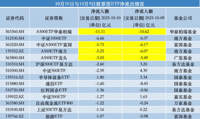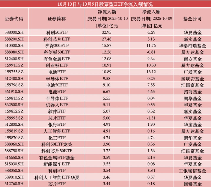 股票型ETF连续两日净流入超百亿元。 周五,A股低开低走,沪指失守3900点。截至10月10日收盘,上证综指跌0.94%,报3897.03点;科创50指数跌5.61%,深证成指跌2.7%,创业板指跌4.55%。 ETF资金方面,澎湃新闻记者据Wind数据统计,股票型ETF已连续两日净流入额超百亿元。具体来看,全市场1043只可统计的股票型ETF基金,在10月10日、10月9日的合计净流入额分别为274.54亿元、101.32亿元。 其中,10月10日,多只宽基ETF是吸金的主力。华夏上证科创板50ETF以32.95亿元的单日净流入额领先全市场ETF基金;嘉实上证科创板芯片ETF的净流入额也达27.48亿元;华泰柏瑞沪深300ETF、易方达科创板50ETF、易方达创业板ETF的净流入额均在10亿元以上。 从周五盘面上看,锂电池、半导体产业链、贵金属板块大幅回调,机械、软件、化工、传媒板块普跌。而从周五行业主题ETF的净流入情况来看,对于上述回调板块,场内资金借助股票ETF越跌越买。 例如,南方有色金属ETF、广发电池ETF、国联安半导体ETF、汇添富电池ETF、招商电池ETF、鹏华半导体ETF、华夏机器人ETF、嘉实软件ETF、华夏芯片ETF的周五净流入额均在5亿元以上。 此外,银行、人工智能、化工、新能源也是资金“逆向布局”的重点方向,多只相关主题ETF单日净流入超3亿元。 ![]() 值得注意的是,多只中证A500ETF为近两日资金净流出的主力。 具体来看,A500ETF华泰柏瑞连续两日净流出居前,10月10日与10月9日的单日净流入额分别为11.11亿元、10.62亿元;富国中证A500ETF、南方中证A500ETF、广发中证A500ETF近两日的净流出额均超3亿元。 ![]() 沪指在时隔十年重上3900点后冲高回落,资金的态度与机构的态度是否一致呢? 华夏基金指出,一般来说,一段行情的终结,往往有以下信号:货币转向(货币政策由松转紧)、政策收紧(监管层提示风险过高,出台治理市场炒作的政策),或者估值过高(估值显著超过极值,泡沫化明显)。 “但是目前来看,这些征兆都没有出现,所以我们更倾向于认为:此次调整是一次攀上高点后的正常回踩,不必太过担心。”华夏基金称。 华夏基金认为,10月进入三季报交易窗口,未来一段时间,景气优势或将再度成为市场聚焦的核心。建议关注9月以来盈利预期上修较多的行业,结合性价比逢低布局:AI(游戏、计算机设备、通信设备、元件);先进制造(摩托车、航空航海装备、家电零部件、电池、医疗服务);周期(有色、玻璃玻纤、钢铁、农化制品等);消费(饮料乳品、调味发酵品、宠物经济、饰品等);金融(券商、保险、城商行)。 往后看,博时基金表示,进入10月,美联储延续降息步伐,外部环境整体稳中有进,同时内部也将迎来重要会议,上述宏观场景下市场风险偏好有望维持高位。不过需要注意的是,自623行情启动以来A股整体已经积累较大涨幅,后续需重点关注增量资金尤其是高风险偏好资金的变化情况,预计市场下一阶段或将以时间换空间,放缓斜率并进一步震荡整固。结构配置方面,市场或将围绕“十五五”规划以及三季报进行预期和交易,科技成长在国内外AI产业催化下仍有望占优。 上银基金则称,展望后市,前期涨幅较多的电子、通信等行业需要一定的时间兑现业绩以消化较高的估值,拥挤度较低、估值不高的红利类资产性价比逐步提升。中长期看,全球“资产紧缺”背景延续,美联储降息落地,中东地区地缘政治冲突阶段性缓解,“耐心资本”流入股市的趋势不变。经济层面,“反内卷”政策持续深入,企业盈利迎来改善预期,为市场托底。 上银基金长期看好权益市场的观点没有改变,中长期建议关注三类机会:AI相关产业、中国品牌竞争力提升、以及资源品。