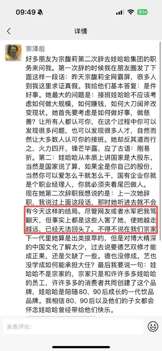 10月10日,据报道称,宗馥莉已于9月12日向娃哈哈集团有限公司辞去董事长等相关职务并已通过集团股东会和董事会的相关程序。工商登记信息显示,目前,宗馥莉仍为娃哈哈集团第二大股东。 10月11日,宗馥莉的叔叔宗泽后在朋友圈发声表示:“尽管网友或者水军把我骂翻天,但事实上都是这些人害了她,使她越走越远,已经无法回头了。不得不说在我们宗家下一代里她算是出类拔萃的,但是对博大精深的中国文化了解太少,过去说要德艺双修才能成正果,还是欠缺了一些。德也没修成。艺也没学成如何能承担大任?” 最后,宗泽后还强调,“娃哈哈不是宗家的,宗家只是和许许多多娃哈哈的员工,许许多多的消费者共同创建了这个品牌,娃哈哈是陪随 80、90 后成长的一代饮品品牌。我相信 80、90 后以及他们的子女都会怀念娃哈哈曾经带给他们快乐。”