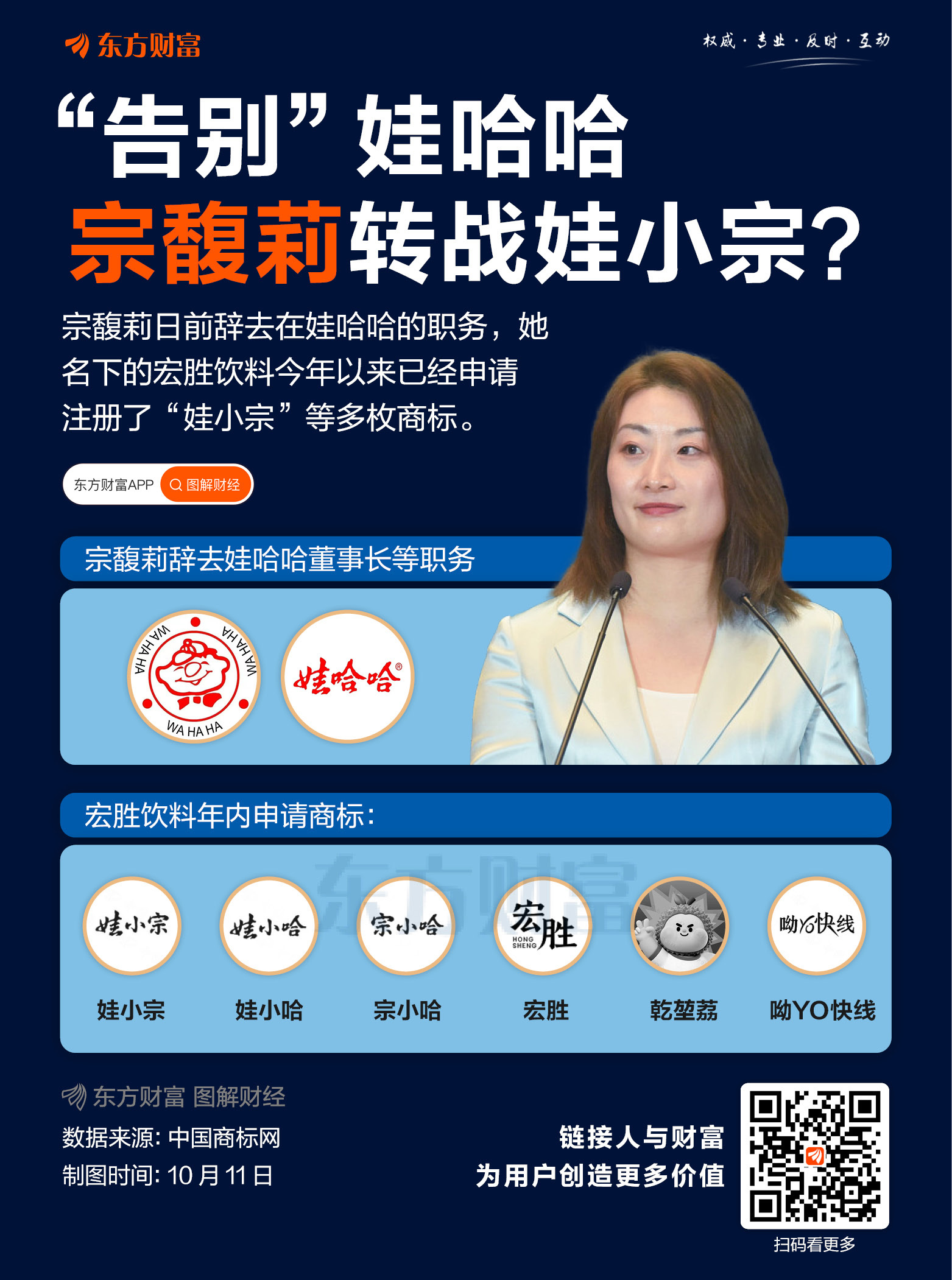 ![]() 宗馥莉辞任娃哈哈集团董事长等职务一事近日冲上热搜。据《每日经济新闻》消息,10月10日娃哈哈集团召开董事会,通过宗馥莉辞职事项,任命许思敏为娃哈哈集团总经理,董事长职务空缺。当日晚,娃哈哈方面确认宗馥莉已辞职。 虽然已辞任相关职务,但据娃哈哈集团2024年年报,宗馥莉还持有娃哈哈集团29.4%的股份,为第二大股东。第一大股东是杭州上城区文商旅投资控股集团有限公司,持股比例46%,第三大股东为娃哈哈集团职工持股会,拥有24.6%的股份。 此外,宗馥莉还是宏胜饮料集团的实际控制人。宏胜饮料集团成立于2003年,最初主要负责娃哈哈的代工业务。目前该集团在中国共有16个生产基地,44家子公司,拥有104条国际一流的现代化饮料生产线,主营产品包括果蔬饮料、瓶装饮用纯净水、矿物质水、茶饮料、含乳饮料等。宗庆后曾称赞:“她公司(宏胜饮料集团)的利润率比我(娃哈哈)高。” 中国商标网显示,自今年2月起,宏胜饮料集团提交了60件商标注册申请,包括娃小宗、娃小哈、宗小哈、宏胜、乾堃荔和呦YO快线共六枚商标,其中以娃小宗为主,覆盖了食品、啤酒饮料等40多个门类。目前“娃小宗”已注册了微博账号,账号认证主体为宏胜饮料集团。