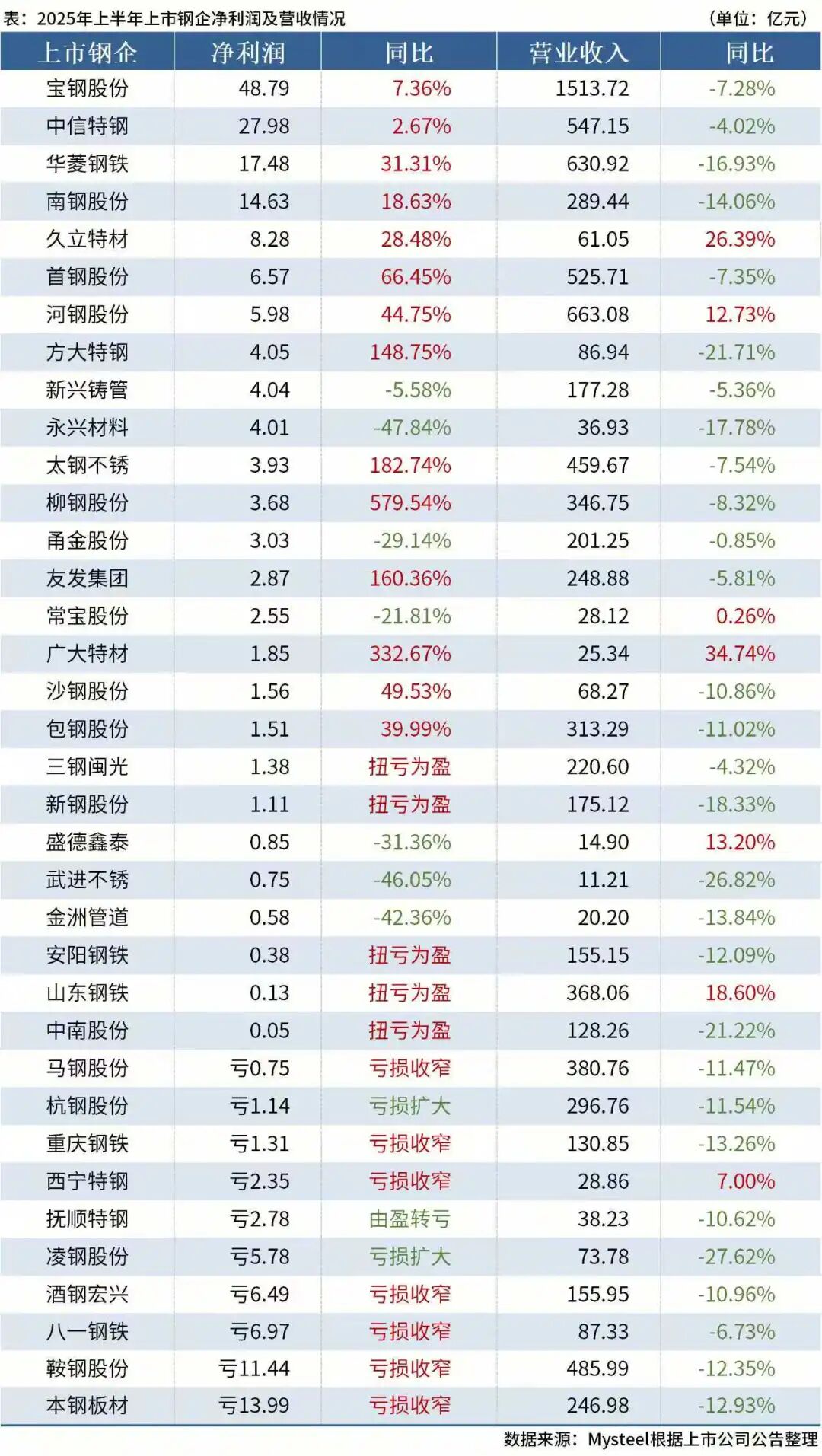 全新妙想投研助理,立即体验 在钢铁行业整体下行的背景下,部分钢铁企业率先迎来复苏。10月10日,山东钢铁发布的业绩预告显示,预计2025年前三季度经营业绩持续向好,盈利能力显著提升,实现利润总额6.32亿元左右,同比增长约21.96亿元;实现归属于上市公司股东的净利润约1.40亿元,同比增长约15.91亿元;扣除非经常性损益的净利润1.38亿元左右,同比增长约16.13亿元。 今年以来,山东钢铁止亏增盈成效显著,其半年报显示,尽管上半年实现营业收入368.06亿元,同比下降18.60%,但毛利率提升至6.02%,同比增加4.15个百分点,实现归母净利润1252.58万元,扭亏为盈。 钢企盈利状况改善,并非山东钢铁一家。期货日报记者梳理上市钢企半年报发现,今年以来,我国钢铁行业供需矛盾有所缓和,钢材出口继续强劲增长,上半年钢铁行业盈利能力整体回升,多家上市公司扭亏为盈或大幅减亏,如柳钢股份、安阳钢铁、新钢股份、中信特钢等。 ![]() 市场人士认为,上述现象是钢企成本降低与风险管理共同作用的结果。当下,利用期货工具避险和降本增效是钢企度过“寒冬”的共同选择。 营收普降,利润反增 记者注意到,今年上半年,虽然大部分钢企营收下降,但净利润却扭亏为盈。据中钢协数据,上半年重点统计钢铁企业营业收入同比下降5.79%,利润总额同比增长63.26%。 “今年上半年,上市钢企呈现‘利润端头部集中、成本红利主导’的特点。宝钢、中信特钢、华菱钢铁合计占据行业超80%的利润;华菱钢铁等企业的汽车钢、电工钢等高附加值钢材占比提高,其溢价能力对冲了普钢价格下跌的影响,并给上市钢企带来了更高的利润。此外,上半年焦煤价格大幅下跌,导致焦炭等炉料价格走低,压低了吨钢成本,也导致上市钢企利润大幅好转。”新湖期货副总经理李强告诉记者。 上市钢企营收下降,原因在于钢价下跌,但不同钢材品种受内需、进出口市场变化影响而有所不同。数据显示,上半年,中国钢材价格指数(CSPI)下跌7.09%。以上海市场价格为例,上半年现货主流规格螺纹钢、热卷、中板、冷轧及带钢价格的下跌幅度分别为7.92%、5.85%、3.24%、17.03%和7.37%。 李强介绍,上半年上市钢企呈现“利润修复、营收疲软”的分化局面:36家上市钢企合计净利润为115.02亿元,其中26家实现盈利,但多数企业营收同比下滑,主要原因是原料降价幅度远大于成品钢材价格的跌幅,为上市钢企盈利改善创造了条件。