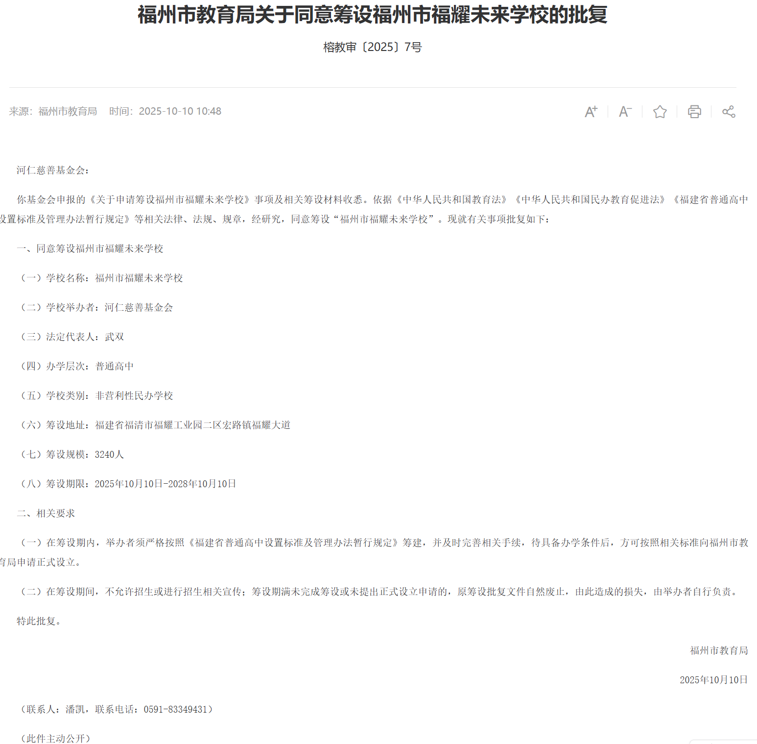 批复内容显示,“福州市福耀未来学校”由河仁慈善基金会举办,办学层次为普通高中,学校类别为非营利性民办学校,筹设地址位于福清市福耀工业园二区宏路镇福耀大道,筹设规模为3240人,筹设期限为三年(2025年10月10日-2028年10月10日)。