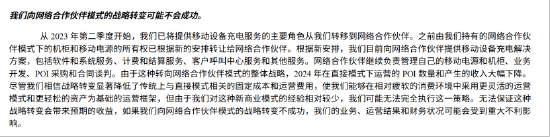 在徐牧看来,怪兽充电宝业务营收下滑,背后最核心的原因在于充电宝产品竞争力的下降,以及公司放弃直营等一系列的管理策略调整,加剧了代理商群体对怪兽充电宝产品的信心减弱,进而转投到了其他竞对体系内。 去年8月,怪兽充电被曝正大面积出售城市直营业务,全面转向代理加盟模式。据怪兽充电内部人士对《BUG》栏目透露:“除上海、成都等核心城市优质点位仍在保持运营外,其余城市直营点位已在打包出售,转卖给区域代理商。” 据徐牧介绍,在这一次调整中,由于怪兽充电主动放弃直营引发合作伙伴恐慌,彼时一些万台规模级别的怪兽充电代理商,开始接触美团充电宝、竹芒等竞对,不再将鸡蛋放在同一个篮子中。“我们的代理商中就有大量来自怪兽充电的,至少1/4的代理商同时也在做怪兽等友商业务,去年有大批它们的代理找过来聊合作。” 有意思的是,除了代理商信心的动摇之外,似乎怪兽充电的整个管理层,对于公司充电宝业务的信心,也正在减弱。 在今年4月末发布的2024年年报中,在长达161页的年度报告(不含合并财务报表明细和独立注册会计师事务所报告)中,怪兽充电花了54页的长篇幅来深入地分析公司发展所面临的风险。整个财报看下来鲜能看到公司对于未来发展的“信心”与斗志,更多的则是“危机感”与“信心不足”。 怪兽充电坦言:“公司过去曾出现净亏损,未来可能无法实现或维持盈利能力。”其还进一步指出,“公司向网络合作伙伴模式(即全面转代理加盟模式)的战略转变可能不会成功”。