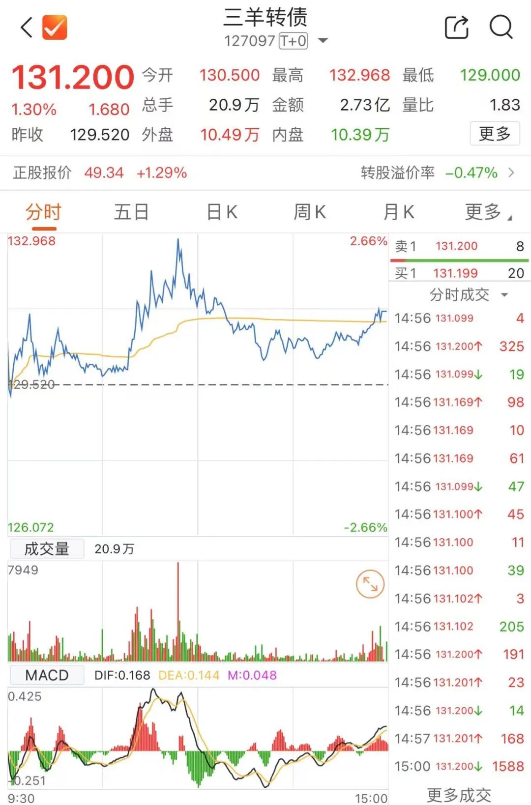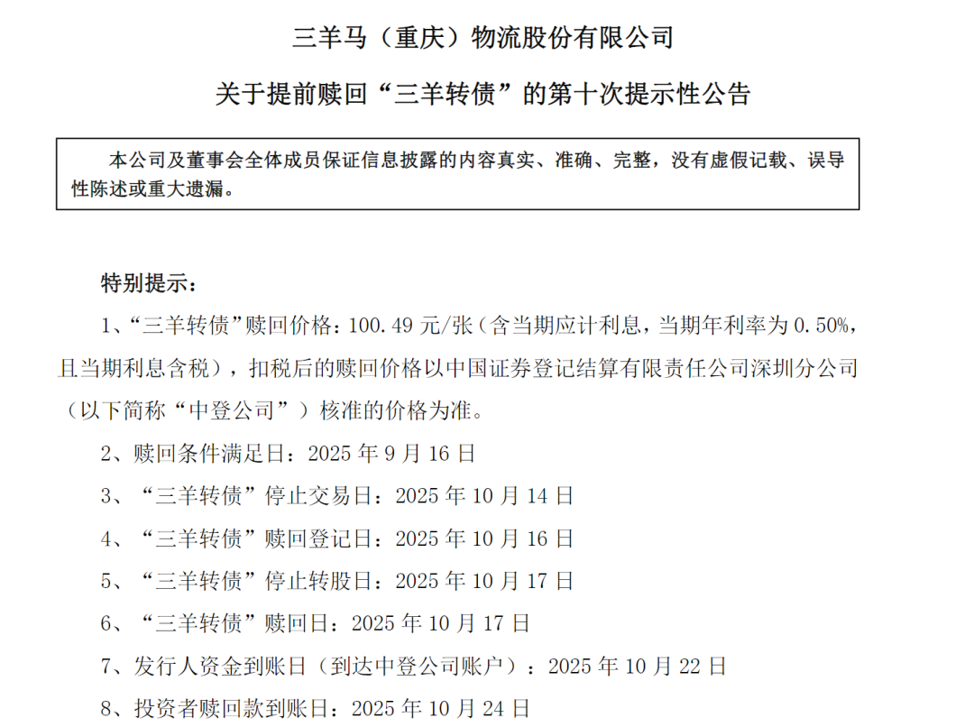 10月13日,是三羊转债的最后交易日。三羊转债10月10日收盘价为131.20元/张,如果投资者不及时交易或转股而被强制赎回,可能亏损超23%。此前,豪24转债部分持有者就因未及时操作导致亏损62%以上。此外,除三羊转债外,中辰转债、鹿山转债、科达转债、景兴转债也即将迎来最后交易日。 ![]() 操作不及时或将亏损超23% 10月10日,三羊马发布关于提前赎回“三羊转债”的第十次提示性公告,提醒投资者10月13日为三羊转债最后一个交易日,10月16日是最后一个转股日,债券持有人应及时卖出或转股。10月16日收市后,未实施转股的三羊转债将全部冻结,停止交易和转股。 ![]() 根据公告,10月13日(含当日)收市前,债券持有人可选择在债券市场继续交易。10月13日至16日(含当日)收市前,债券持有人可以37.43元/股的价格转换为公司股份。10月16日收市后,未及时转股的可转债将按照债券面值加当期应计利息的价格100.49元/张被强制赎回。 截至10月10日收盘,三羊转债收盘价为131.20元/张。对照强赎价格,投资者若是未及时操作,或将亏损超23%。截至目前,三羊转债仍有1.24亿元余额尚未完成交易或转股,所占比例接近60%。 除三羊转债外,中辰转债、鹿山转债、科达转债、景兴转债也即将迎来最后交易日。上述转债最后交易日分别为10月14日、10月14日、10月15日和10月17日。 截至10月10日收盘,中辰转债、鹿山转债、科达转债、景兴转债收盘价分别为145.500元/张、143.957元/张、131.053元/张和189.047元/张。对照各自的强赎价格,不及时操作或将亏损超30%、30%、22%和46%。截至目前,中辰转债、鹿山转债、科达转债、景兴转债仍分别有余额0.67亿元、0.99亿元、1.12亿元和1.56亿元,分别占发行总额的比例超过11%、18%、21%和12%。 ![]() ![]() ![]() ![]() 触发强赎后如何操作? 所谓可转债强制赎回,是指在可转债转股期内,所属公司股票连续30个交易日中至少有15个交易日收盘价不低于转股价格的130%,上市公司有权以债券面值加应计利息的价格总和来赎回全部或部分未转股的可转债的行为。 对于投资者而言,如若触发了强赎机制,应该在规定期限内卖出或者转股。否则,上市公司将会以略高于面值的价格赎回可转债,届时投资者尤其是热衷于追涨高溢价可转债的投资者将可能面临较大损失。 面对可转债强赎,大多数投资者可以进行两种操作来规避不必要的风险。第一种是直接卖掉可转债,落袋为安,由于可转债是T+0交易,投资者可以随时卖出;第二种是在炒股软件中进行转股操作,但投资者要注意,转股后的可转债就变成了股票,交易规则也从T+0变成了T+1,当日无法进行卖出交易。 值得注意的是,可转债新规新增了最后交易日标识,即在可转债最后交易日的证券简称前增加“Z”标识,以向投资者充分提示风险,投资者看到此标识时应及时进行操作。若未及时卖出,停止交易后还将有3个交易日的转股时间,此时只能进行转股操作。