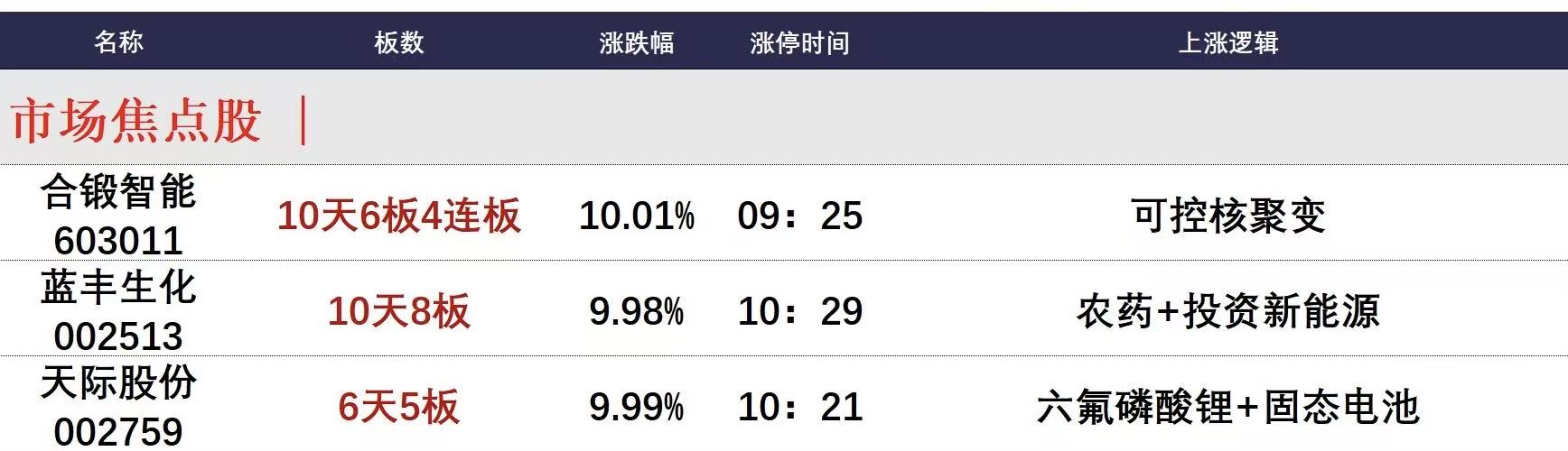 今日午盘全市场共37股涨停,连板股总数11只,17股封板未遂,封板率为68%(不含ST股、退市股)。焦点股方面,可控核聚变概念股反复活跃,合锻智能10天6板、安泰科技3连板,六氟磷酸锂概念股天际股份6天5板、石大胜华5天3板。此外,蓝丰生化上演“地天板”走出10天8板。