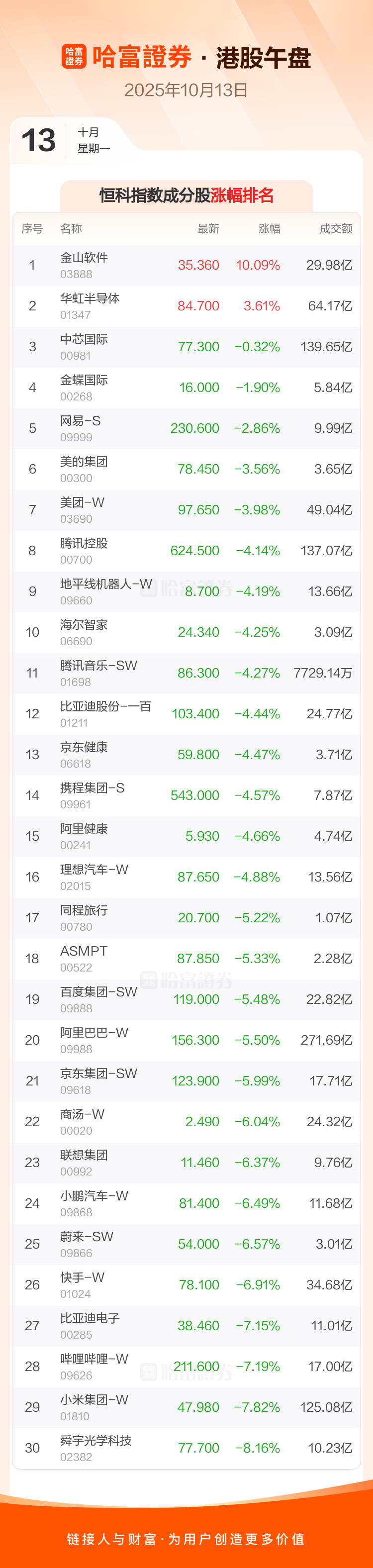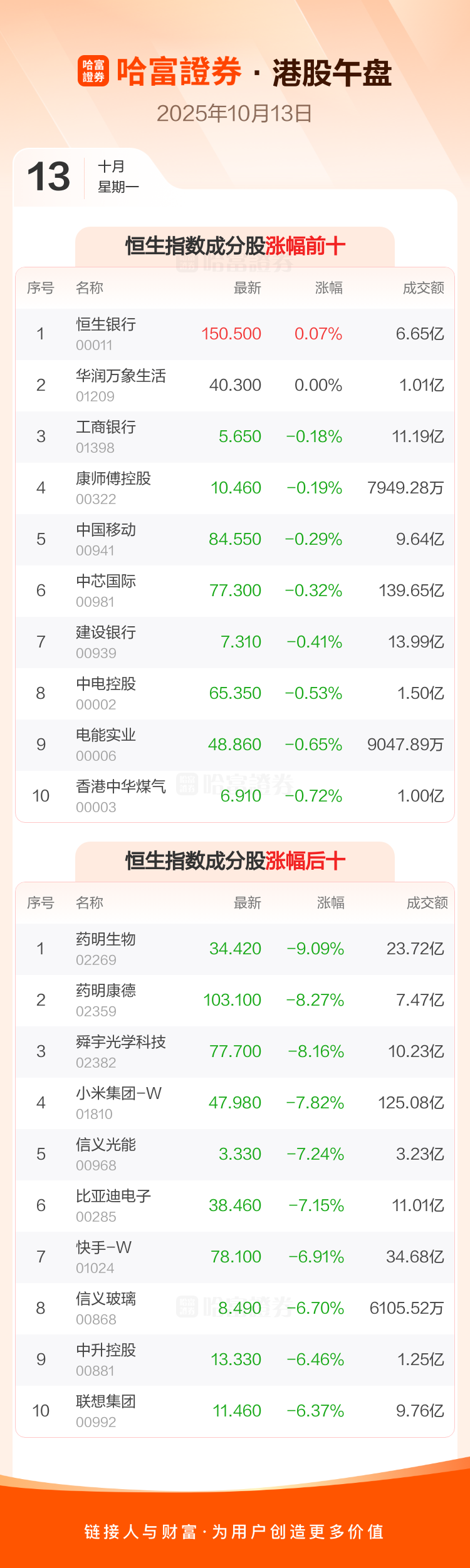 港股10月13日午盘走低 ,恒生指数收报25374.0点,跌916.32点,跌幅3.49%;恒生科技指数收报5975.43点,跌284.32点,跌幅4.54%。恒生指数成分股中恒生银行、华润万象生活、工商银行涨幅居前,药明生物、药明康德、舜宇光学科技跌幅靠前。恒生科技指数成分股中金山软件、华虹半导体、中芯国际涨幅居前,舜宇光学科技、小米集团-W、哔哩哔哩-W跌幅靠前。