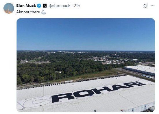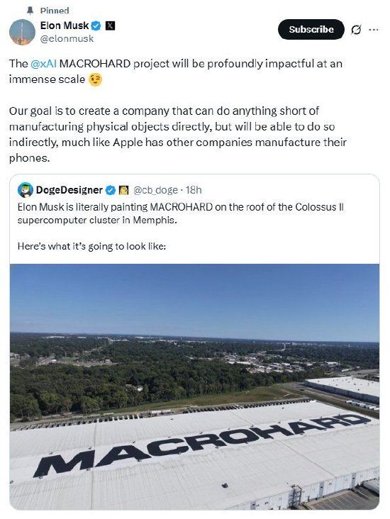 从图中可见正在喷涂的“MACROHARD”字样。此前,他回应网友称,“我们确实正在孟菲斯的巨像II超级计算集群的屋顶上喷涂MACROHARD,字体大到你可以从太空中看到它。” 他进一步解释称:“xAI的MACROHARD项目将在巨大规模上产生深远影响。我们的目标是创建一家除了不直接制造物理物体之外,能够做任何事情的公司,不过它将能够间接做到这一点,就像苹果让其他公司制造他们的手机一样。”