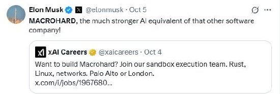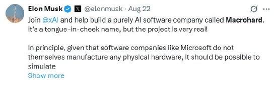 就在本月初,他转发了MACROHARD的招聘信息并调侃道:“MACROHARD,一个比那家软件公司强大得多的人工智能同类产物!”