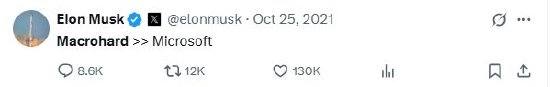 而早在2021年,他发文调侃“Macrohard>>Microsoft(微软)”。据报道,马斯克与微软创始人比尔・盖茨不和,“巨硬”则是对标微软公司名称。