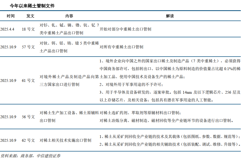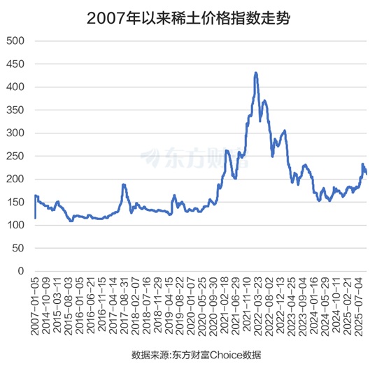 受外围利空,A股三大指数10月13日早盘低开之际,稀土永磁板块逆市走强,早盘收盘时板块指数大涨5.36%,居概念涨幅榜首位。 个股而言,银河磁体、新莱福、北矿科技、华宏科技、安泰科技、包钢股份涨停;九菱科技、惠城环保、奔朗新材、金力永磁、钢研纳克、三川智慧、西磁科技、中科磁业、大地熊大涨超10%。 ![]() 两大利多因素发酵 对于稀土永磁板块的逆市走强,综合市场观点来看,以下两点正被市场较多提及: 一是稀土领域的管制力度全面升级。中信证券研报表示,10月9日,商务部联合海关总署等部门发布多项公告,对稀土相关物项、技术、设备及原辅料实施出口管制,管制范围从境内扩展至境外,新增稀土二次资源回收利用相关技术及生产线装配、调试、维护等技术的出口管制,基本覆盖稀土全产业链,并首次涉及半导体及人工智能领域。 ![]() 二是稀土巨头再度宣布提价。包钢股份、北方稀土10月10日晚间发布公告称,上调2025年第四季度稀土精矿关联交易价格。据悉,北方稀土将2025年第四季度稀土精矿交易价格调整为不含税26205元/吨(干量,REO=50%),环比增长37%。REO(稀土氧化物)每增减1%,不含税价格增减524.10元/吨。 据财联社报道,稀土精矿交易价格已连续5次上调。此前5个季度稀土精矿交易价格分别为16741元/吨、17782元/吨、18618元/吨、18825元/吨、19109元/吨,环比增幅分别为6.2%、4.7%、1.1%、1.5%。 而稀土行业协会发布的稀土价格指数显示,稀土价格指数10月11日报210.8,较2024年末的163.8上涨28.69%。自2024年7月中旬创出阶段低点后,稀土价格指数便一路震荡上行,期间最大涨幅为52.12%。 ![]() 稀土价值重估正当时 往后看,不少机构认为,稀土资源的价值有望迎来重估。德邦证券研报指出,稀土作为高端制造与战略新兴产业的核心资源,正呈现供需两端共振格局。一方面,我国通过配额管理与出口管制强化了产业链的战略主动权,确保资源向高端应用环节倾斜;另一方面,全球绿色转型与“双碳”目标持续推升镨、钕等关键元素需求,带动永磁材料等新兴应用快速扩容。在供给集中度提升与需求结构升级的背景下,稀土产业链的战略地位有望进一步巩固,为高端制造发展注入长期驱动力。 根据海关总署披露的数据显示,我国稀土的出口量在7月、8月、9月连续下降。数据显示,我国7~9月的出口量分别为5994吨、5792吨,4000吨,环比分别减少1748吨、202吨、1792吨。今年6月份,我国稀土出口创有数据以来的最高值,当月出口达7742吨。 ![]() 中信证券持有类似观点,认为稀土行业供需格局或持续向好,稀土板块业绩或持续上行。该机构认为,新能源汽车、风电、节能电机等产业顺应低碳环保的政策趋势,人形机器人或将成为新增长极,预计2027年全球钕铁硼需求有望增至32.9万吨,对应2024-2027年CAGR为13%。 中信证券还预计头部企业集中度将明显上升。该机构测算,2024年钕铁硼行业CR4约为29%,随着头部公司扩产落地,预计2026年钕铁硼行业CR4有望升至42%。传统需求旺季以及到来,供需格局或持续向好,稀土价格有望稳中有进,预计今年三、四季度稀土产业链业绩或逐季提升,持续推荐稀土产业链战略配置价值。 中信建投则表示,要重视稀土的战略配置机遇。日前商务部连发四文强化稀土出口管制,增加5类中重稀土出口管控,增加全产业链条设备、技术、原辅材料出口管制,并对海外军事及高端半导体需求进行管制,稀土战略地位进一步强化。眼下的四季度,中信建投认为,四季度是新能源车、风电设备等下游领域的生产旺季,对稀土永磁材料的采购需求预计会集中释放,对价格仍有支撑。