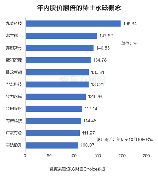 板块11股年内翻倍 今年以来,稀土永磁板块持续走强,截至10月10日板块指数累计大涨69.15%,而同期沪深300指数上涨17.33%。 个股而言,东方财富Choice数据显示,在剔除年内上市新股后,九菱科技暂居稀土永磁板块“涨幅王”位置,年内涨幅196.34%。北方稀土紧随其后,年内上涨147.62%。奔朗新材排在第三,年内上涨140.53%。 整体而言,稀土永磁板块56只概念股,年内有55股上涨,上涨概率约98%。板块中29股年内涨超50%,11股股价翻倍。 ![]() (文章来源:东方财富研究中心) |