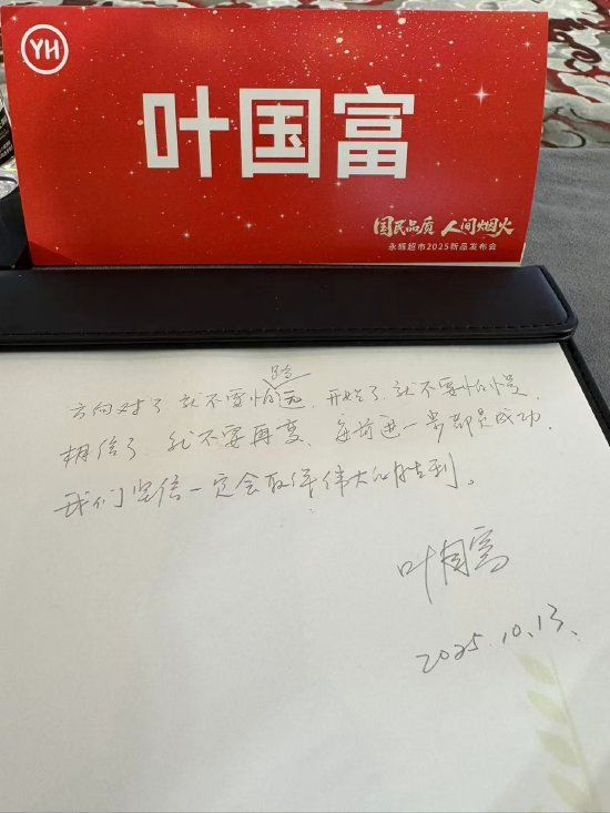 丁冬科技讯 10月13日上午消息,永辉超市(601933)举行2025新品发布会,名创优品创始人、董事会主席兼首席执行官,永辉超市非独立董事、改革领导小组组长叶国富出席。 叶国富在会上有感而发,并在会议纸上写道:“方向对了,就不要怕路远。开始了,就不要怕慢。相信了,就不要再变。每前进一步都是成功,我们坚信一定会取得伟大的胜利。”