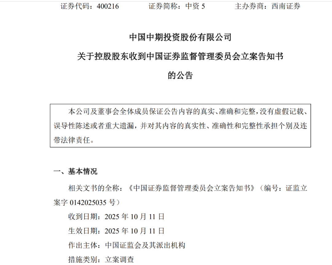 在丁冬财经看资讯行情,选丁冬财经证券一站式开户交易>> 退市不免责,再添新例。 10月13日晚间,已退市1年多的中国中期投资股份有限公司(以下简称中国中期)公告称,控股股东中期集团有限公司于10月11日收到《中国证券监督管理委员会立案告知书》。 ![]() 公告显示,因涉嫌信息披露违法违规,根据《中华人民共和国证券法》《中华人民共和国行政处罚法》等法律法规,中国证监会决定对中期集团有限公司立案调查。 中国中期表示,上述事项不会对公司生产经营产生重大影响,亦对公司财务方面无重大影响。公司将持续关注上述事项的进展情况,并按照有关法律法规的规定和要求,及时履行信息披露义务。 回溯此前公告,此次中期集团有限公司被立案调查,与其作为公司债券发行人却未及时披露财务报告有关。 2024年12月20日,中国证监会北京监管局公告称,中期集团有限公司及其信息披露事务负责人牟淑云因未按规定披露年度报告和中期报告,受到出具警示函的行政监管措施。具体而言,中期集团有限公司未在2023年结束之日起4个月内披露2023年年度报告,也未在2024年上半年结束之日起2个月内披露2024年中期报告,违反了《公司债券发行与交易管理办法》的相关规定。 牟淑云作为信息披露事务负责人,对上述违规行为负有主要责任。监管部门强调,中期集团有限公司及相关责任人应对此次处罚引以为戒,提升信息披露的质量,确保类似事件不再发生。 资料显示,中国中期于1994年8月成立,2000年7月在深交所挂牌上市。公司主营汽车服务业务,主要包括品牌汽车及配件销售、汽车维修、汽车养护美容、信息咨询服务、汽车金融服务、汽车保险经纪、汽车电子商务等服务业务。 2022年,中国中期实现营收约3178万元,同比减少35.77%;归属于上市公司股东的净利润亏损约340万元。因2022年度经审计的扣除非经常性损益前后的净利润孰低者均为负值,且扣除与主营业务无关的业务收入和不具备商业实质的收入后的营业收入低于1亿元,公司股票2023年5月5日起被实施退市风险警示。 时间来到2024年,因中国中期2023年年报被出具无法表示意见的审计报告,触及深交所《股票上市规则(2023年8月修订)》第9.3.11条第一款第三项规定的股票终止上市情形,深交所决定终止中国中期上市,公司股票于2024年6月8日被摘牌。 近期,随着监管层“退市不免责”原则逐步落地,退市追责的力度及范围增大,越来越多的已退市公司收到罚单。 据记者不完全统计,8月以来,已有华铁股份、泰禾集团、龙宇股份、亿利洁能等多家已退市公司及其相关责任人被监管追罚。 资深市场人士认为,如今监管追责已贯穿公司上市、经营、退市全周期,这种“全链条追责”模式将有效震慑市场违法行为。未来,随着监管体系的不断完善,“退市不免责”的执法力度有望进一步加强,监管部门将持续织密监管防线,让违法者无处遁形,切实维护资本市场秩序与投资者合法权益。 全新妙想投研助理,立即体验 (文章来源:中国基金报) |