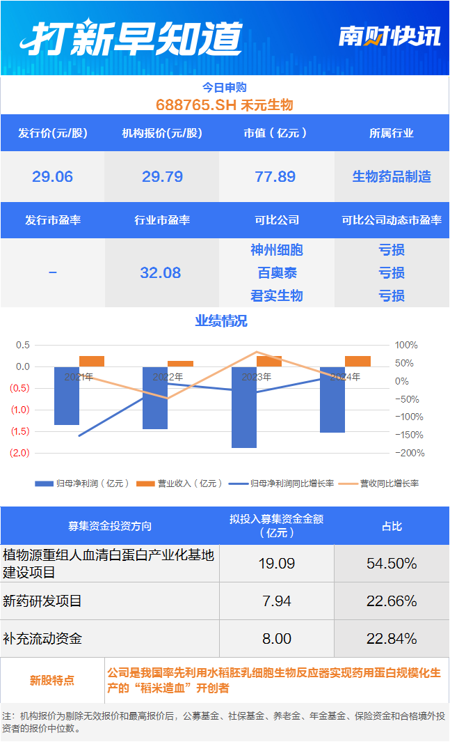 全球首创“稻米造血” 科创成长层“第一股”今日申购丨打新早知道 炒股第一步,先开个股票账户 10月14日,可申购科创板新股禾元生物(688765.SH)。该公司主要从事植物源重组蛋白表达技术研究与产品开发,拥有全球领先的植物生物反应器技术平台,公司基于水稻胚乳细胞生物反应器的表达体系开发了多款药品、药用辅料及科研试剂等产品。公司被誉为“稻米造血”行业开创者。 ![]() 资料显示,人白蛋白被誉为“黄金救命药”,广泛应用于肝硬化、烧伤、手术抢救等临床场景。长期以来,它只能从血浆中提取,我国60%以上依赖进口。 而据禾元生物招股书,不同于传统人白蛋白产品从血浆中分离获得的生产路径,其核心产品HY1001采取了基于水稻种子的植物表达系统,利用基因工程手段使水稻能够在种子阶段表达结构和功能均与天然人白蛋白高度一致的重组蛋白,经过提取、纯化后配制为注射用制剂。 目前,禾元生物全球首创的“稻米造血”技术获得国家“重大新药创制”科技重大专项的支持,自主研发的创新药重组人白蛋白注射液(水稻)已于今年7月通过国家药监局审评获批上市。 值得注意的是,禾元生物还是重启科创板第五套标准后的首家过会并取得注册批文的企业,也是科创成长层首家新发行企业。 从业绩来看,禾元生物当前仍未取得盈利。公司2022-2024年分别实现营业收入1339.97万元、2426.41万元、2521.61万元,同比增幅为-47.49%、81.08%、3.92%;实现归母净利润-14357.63万元、-18696.29万元、-15136.81万元,同比增幅依次为-7.12%、-30.22%、19.04%。 不过,根据最新财务情况,禾元生物亏损有望缩窄。公司2025年上半年实现营业收入1271.05万元,较上年同期增长33.32%;实现归母净利润-8162.78万元,较上年同期减少3.86%。 商业化方面,据招股书介绍,禾元生物年产10吨重组人白蛋白原液及制剂cGMP智能化生产线已建成,并获得药品生产许可证;公司已与国药控股、贝达药业等多家药品经销商签订经销协议,完成了全国30余个省市区域的销售网络布局。 在研药品管线方面,禾元生物拥有8个在研药品管线,其中核心产品HY1001(重组人白蛋白注射液(水稻))为国内首个获批上市的重组人白蛋白药品,并入选工业和信息化部首批《生物制造标志性产品名单》。除HY1001外,禾元生物尚有2个药品处于II期临床试验阶段,2个药品处于I期临床试验阶段,1个药品已获批开展临床试验。 不过,禾元生物也在招股书中提醒,获批上市是药品商业化的起点,后续仍需经历市场准入、教育及推广等环节,方能在一定时间后实现成规模的药品销售收入。同时,产品上市后为了保持技术及产品的领先优势,需要持续较大规模的研发投入,公司短期内可能无法实现盈利,可能无法进行利润分配或现金分红。 此外,禾元生物还强调,虽然HY1001具有先发优势,但目前国内仍有2款重组人白蛋白在研药物已完成III期临床研究,若审评顺利,该等竞品预计将在1-3年后陆续实现获批上市,与HY1001展开竞争,届时公司可能需开展更大规模的研发和营销活动。 想炒股,先开户!选丁冬财经证券,行情交易一个APP搞定>> (文章来源:21世纪经济报道) |